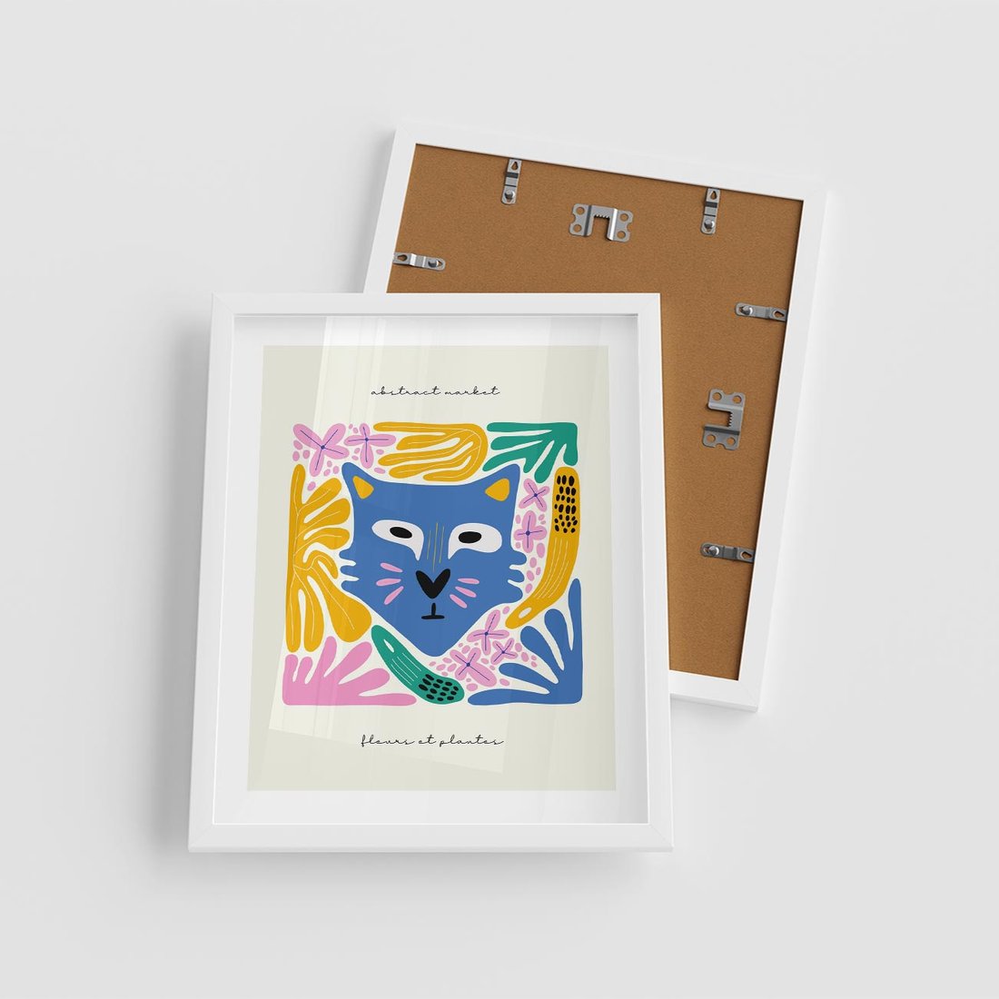 Ten abstrakcyjny plakat przenosi nas w świat eklektycznej sztuki, przedstawiając niebieskiego kota w otoczeniu pastelowych kolorów. Doskonale nadaje się jako ozdoba do salonu, dodając przestrzeni niezwykłego uroku i wyjątkowej atmosfery artystycznego zróżnicowania.