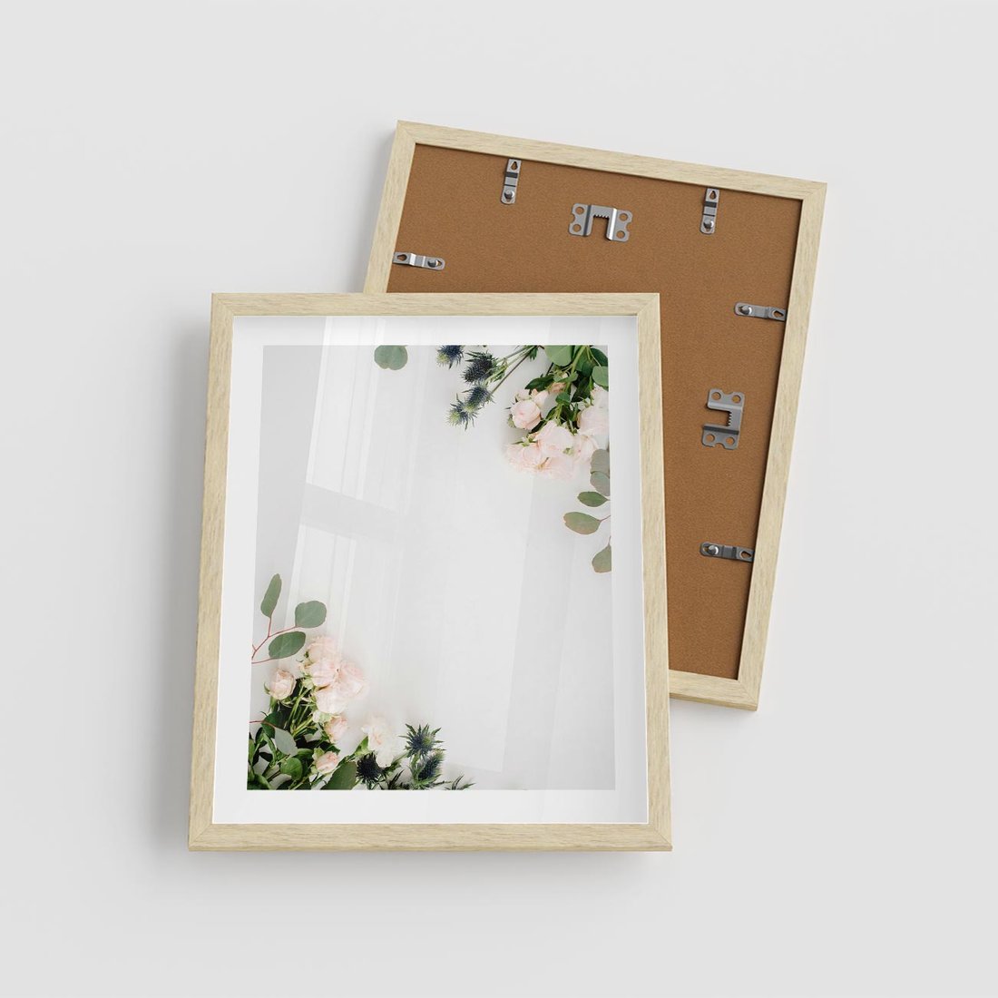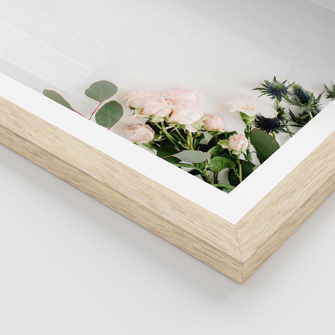 Plakat w ramie 40x50 - Kompozycja z Białych Róż i Eukaliptusa - kompozycja z białych kwiatów na białym tle, róże - rama drewno