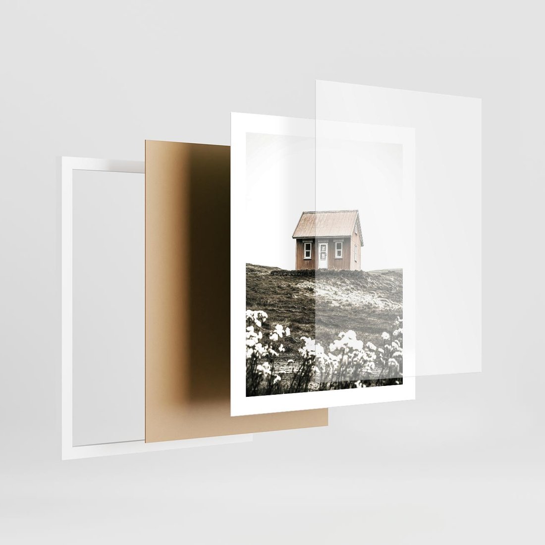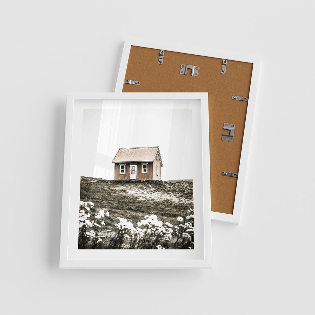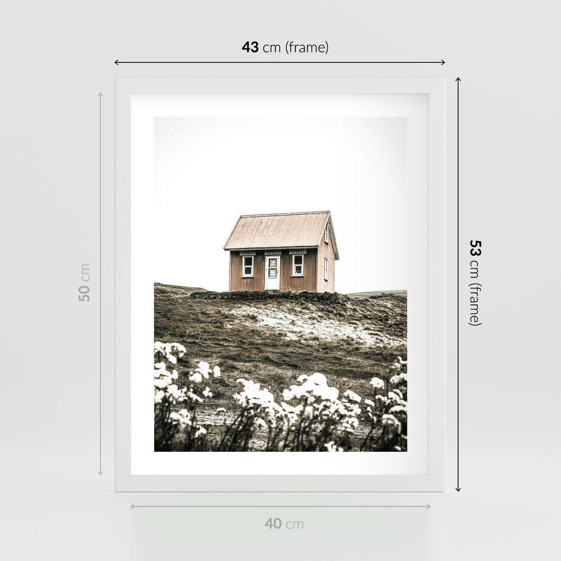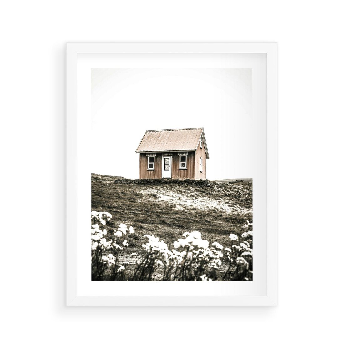 Plakat w ramie 40x50 - Krajobraz z Przeszłości: Kwitnąca Łąka w Sepii - domek na wzgórzu, kwitnąca łąka - rama biała