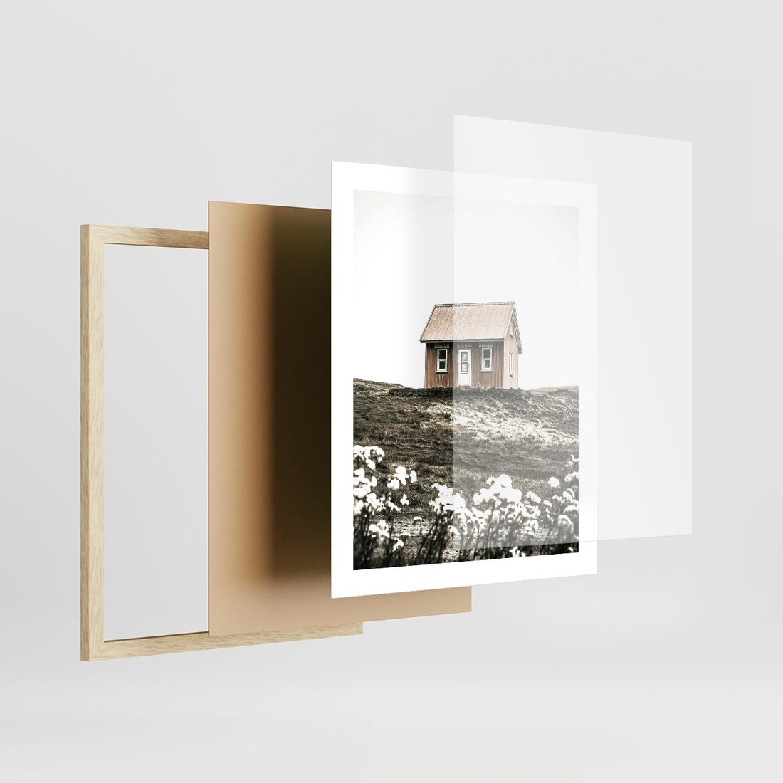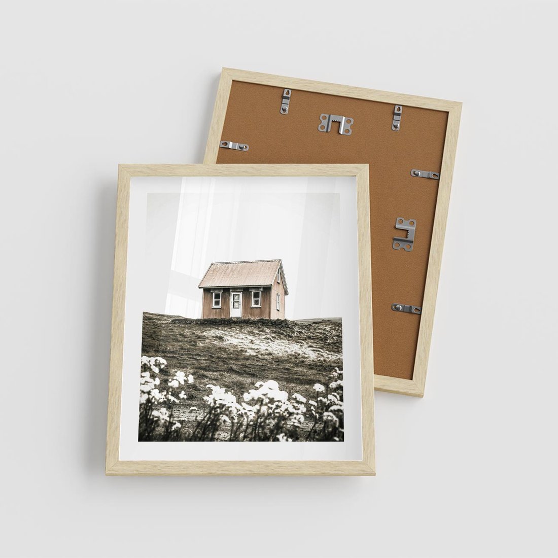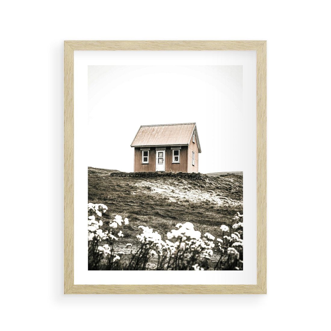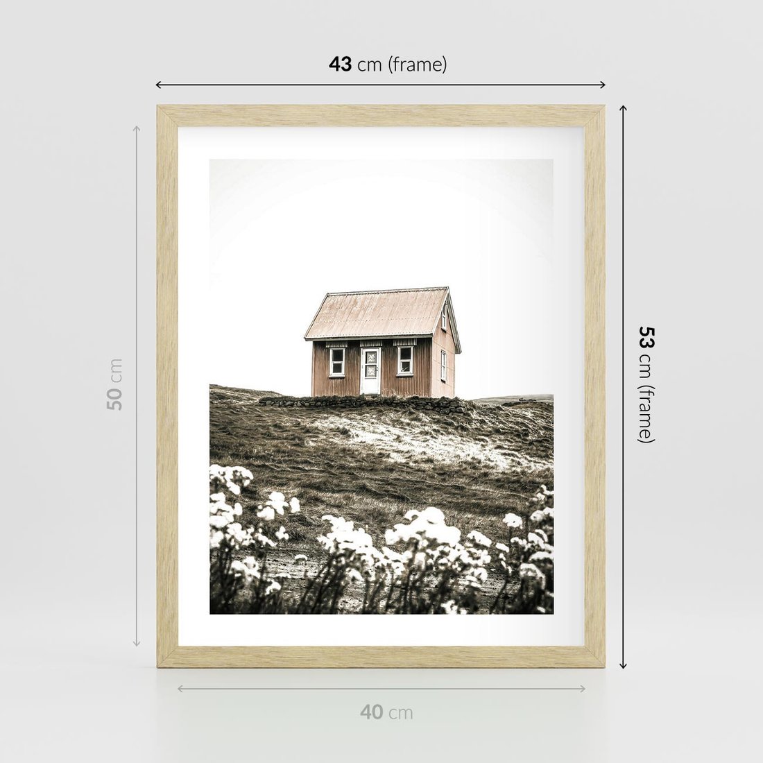 Plakat w ramie 40x50 - Krajobraz z Przeszłości: Kwitnąca Łąka w Sepii - domek na wzgórzu, kwitnąca łąka - rama drewno