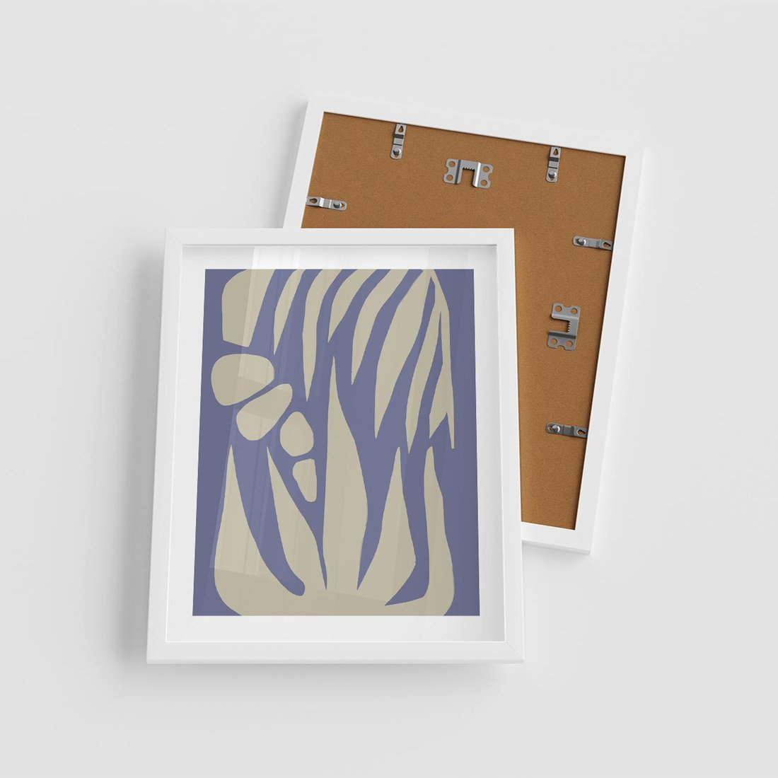 Abstrakcyjna sztuka w skandynawskim stylu, emanująca chabrowym kolorem, łączy prostotę i wyrazistość, tworząc harmonijną atmosferę.