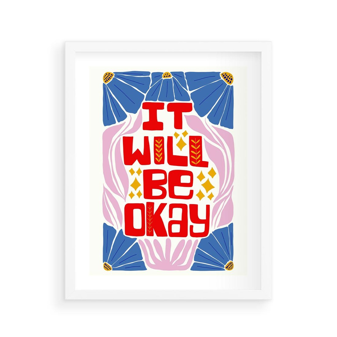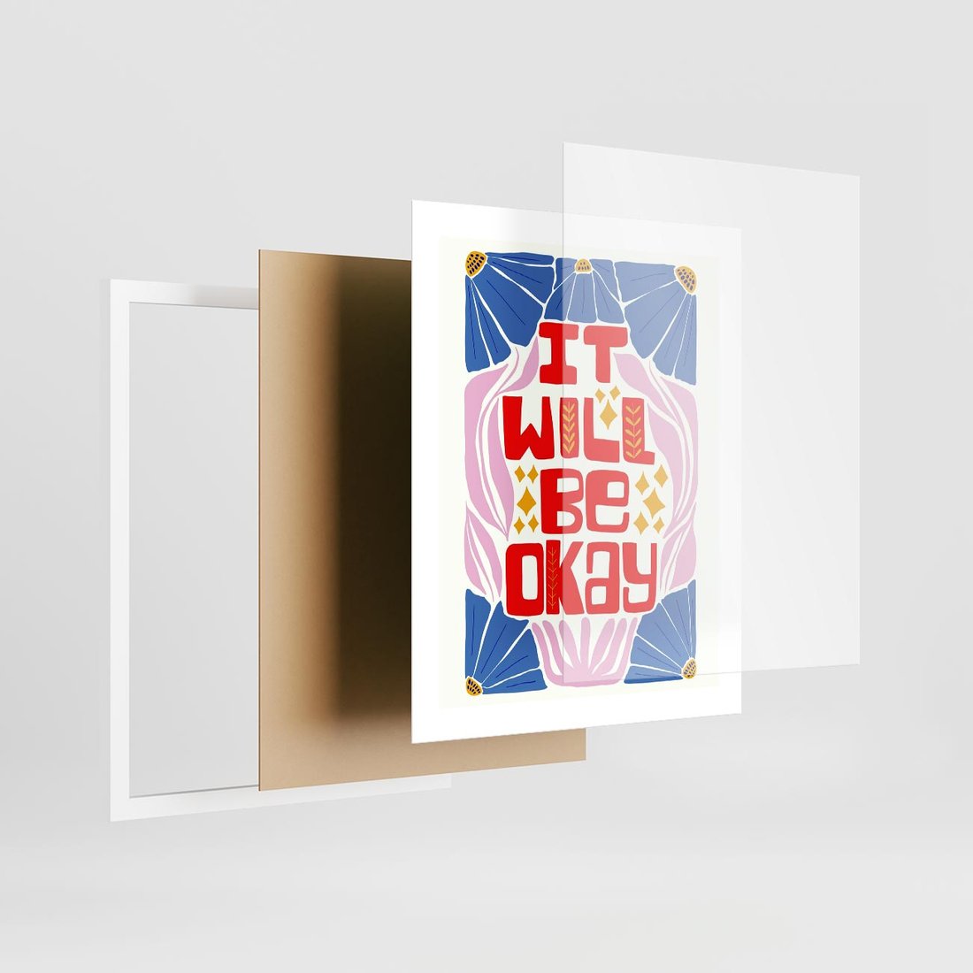 Czerwona typografia wypływa na tle delikatnych pastelowych kwiatów, tworząc inspirującą kompozycję. Ta sztuka emanuje radością i nadaje wnętrzu wyjątkowy urok kwiatowej harmonii.