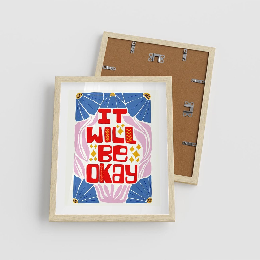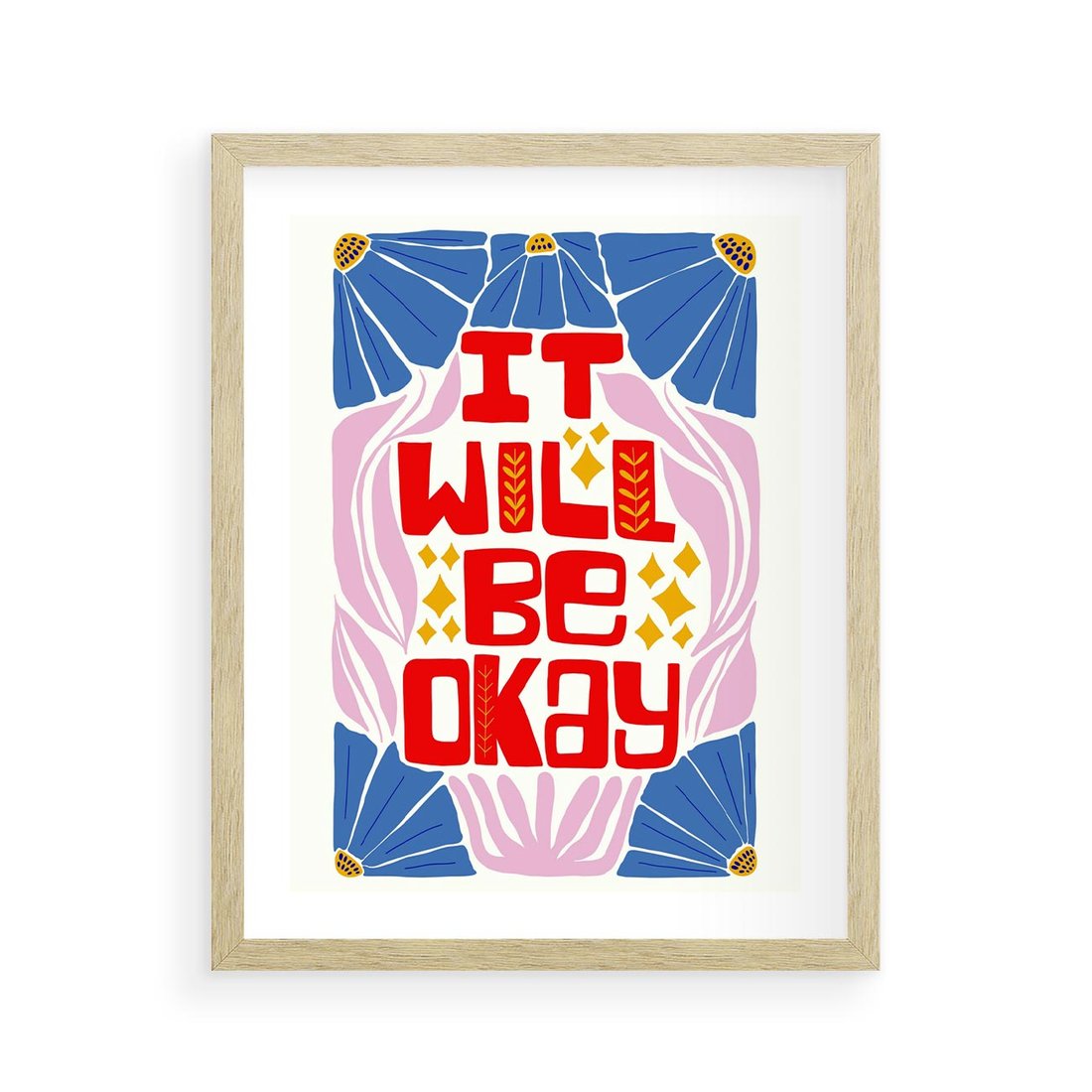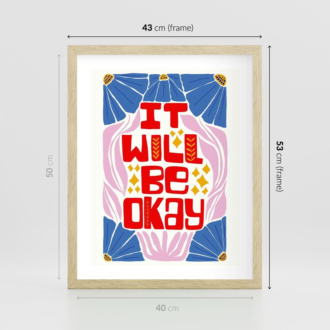 Czerwona typografia wypływa na tle delikatnych pastelowych kwiatów, tworząc inspirującą kompozycję. Ta sztuka emanuje radością i nadaje wnętrzu wyjątkowy urok kwiatowej harmonii.
