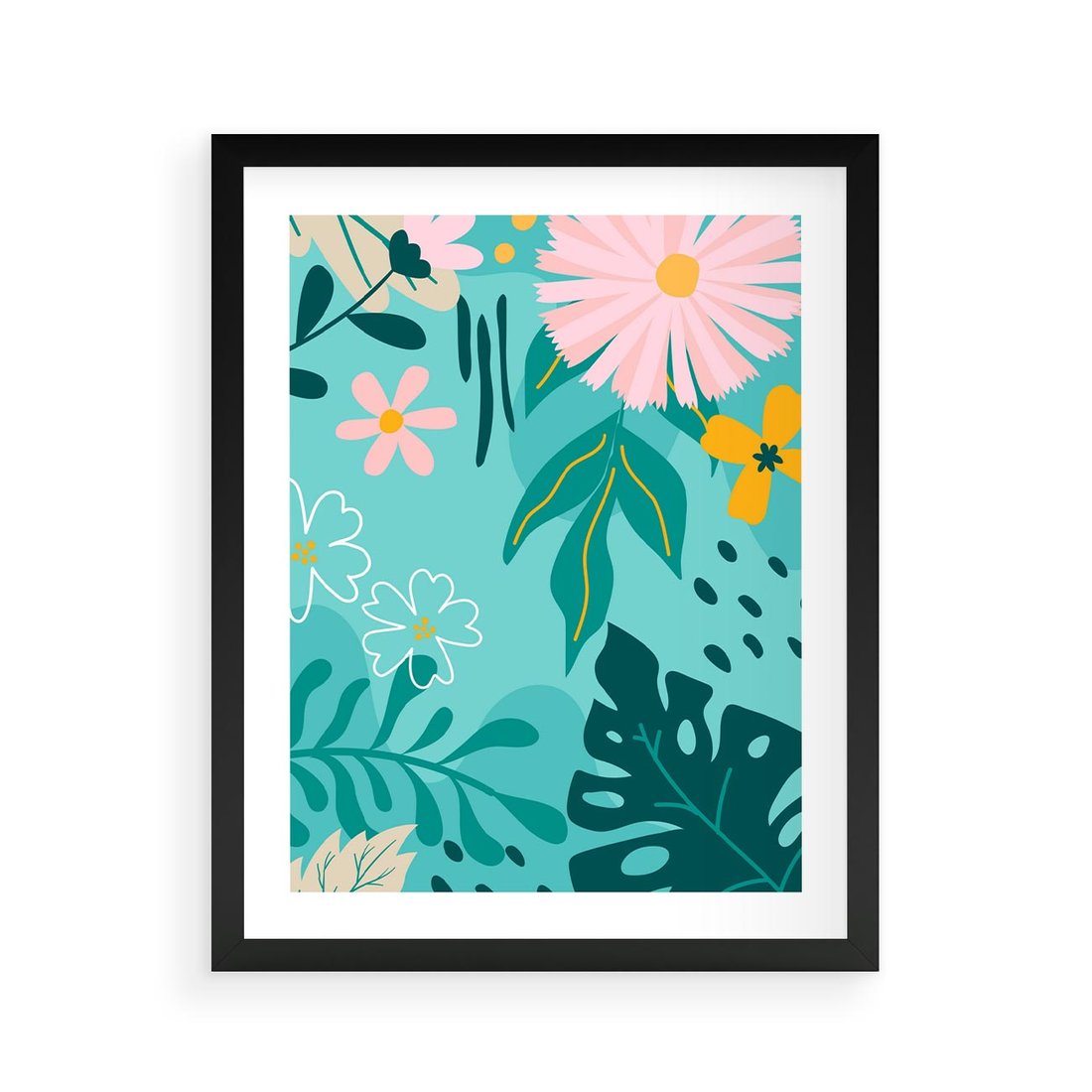 Pastelowa kompozycja z tropikalnymi liśćmi i kwiatami w odcieniach turkusu i różu. To wizualna podróż do tropikalnego raju, dodająca subtelności i koloru Twojej przestrzeni.