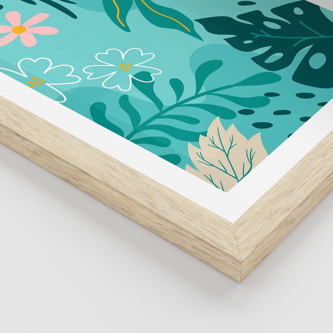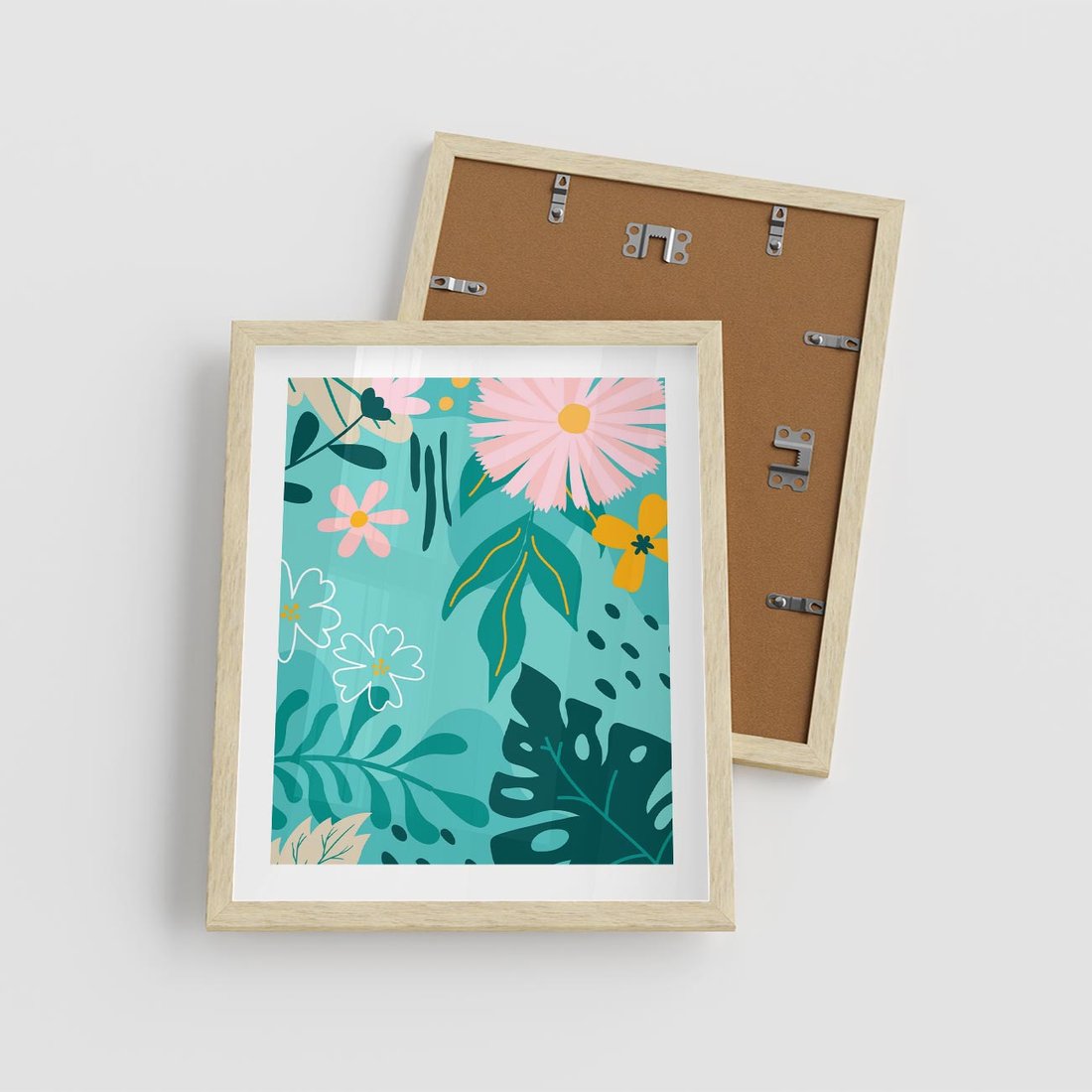 Pastelowa kompozycja z tropikalnymi liśćmi i kwiatami w odcieniach turkusu i różu. To wizualna podróż do tropikalnego raju, dodająca subtelności i koloru Twojej przestrzeni.