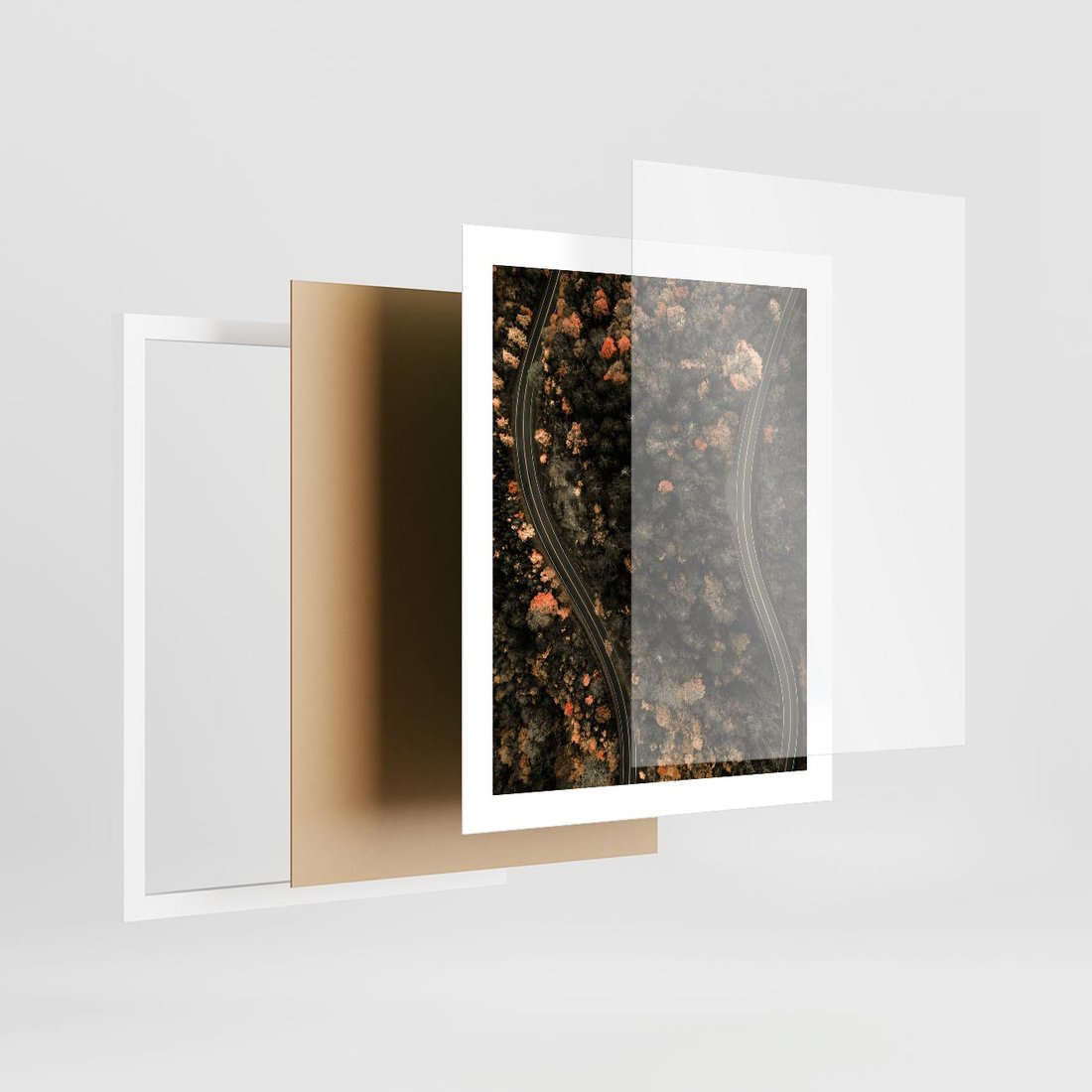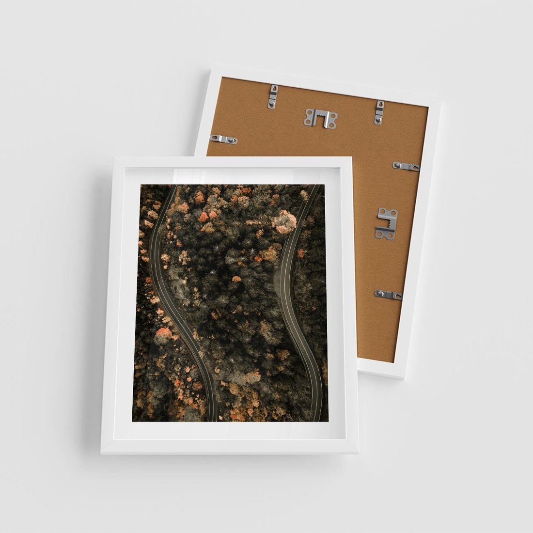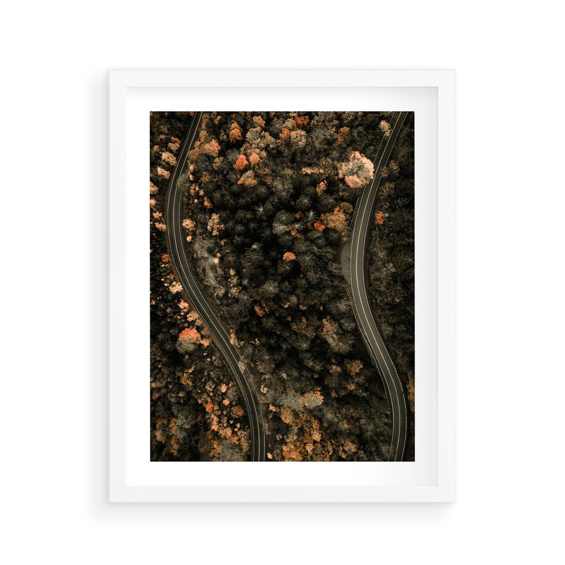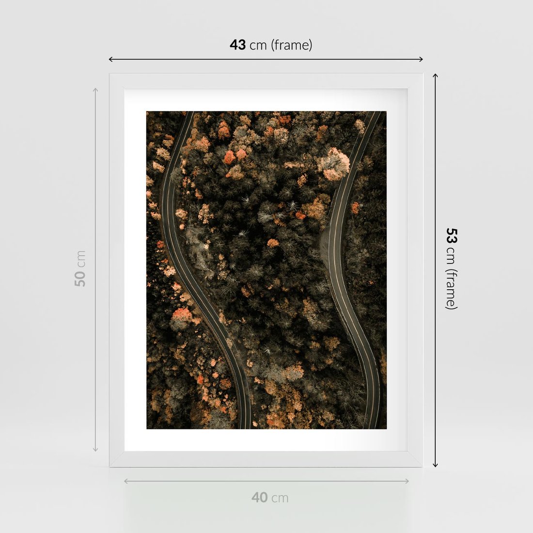 Plakat w ramie 40x50 - Las i Droga w Kolorach Jesieni - droga, ujęcie z góry - rama biała
