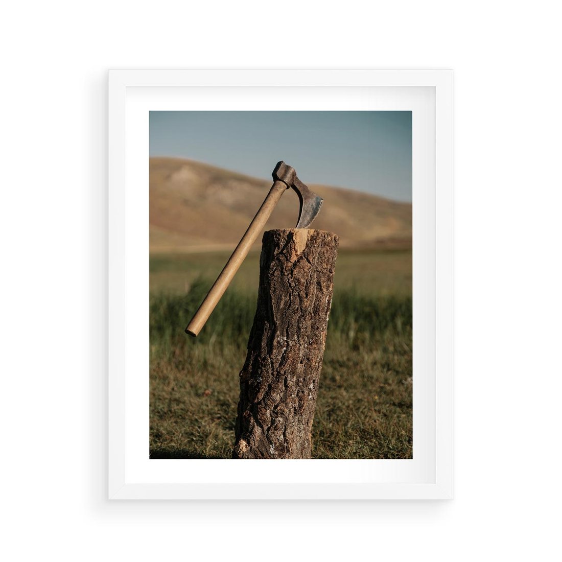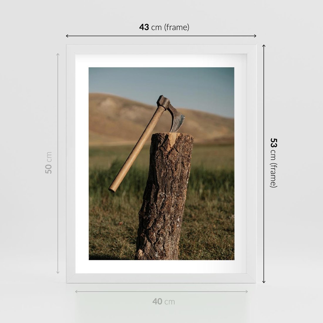 Plakat w ramie 40x50 - Lasowa siła w drewnie - las, siekiera - rama biała