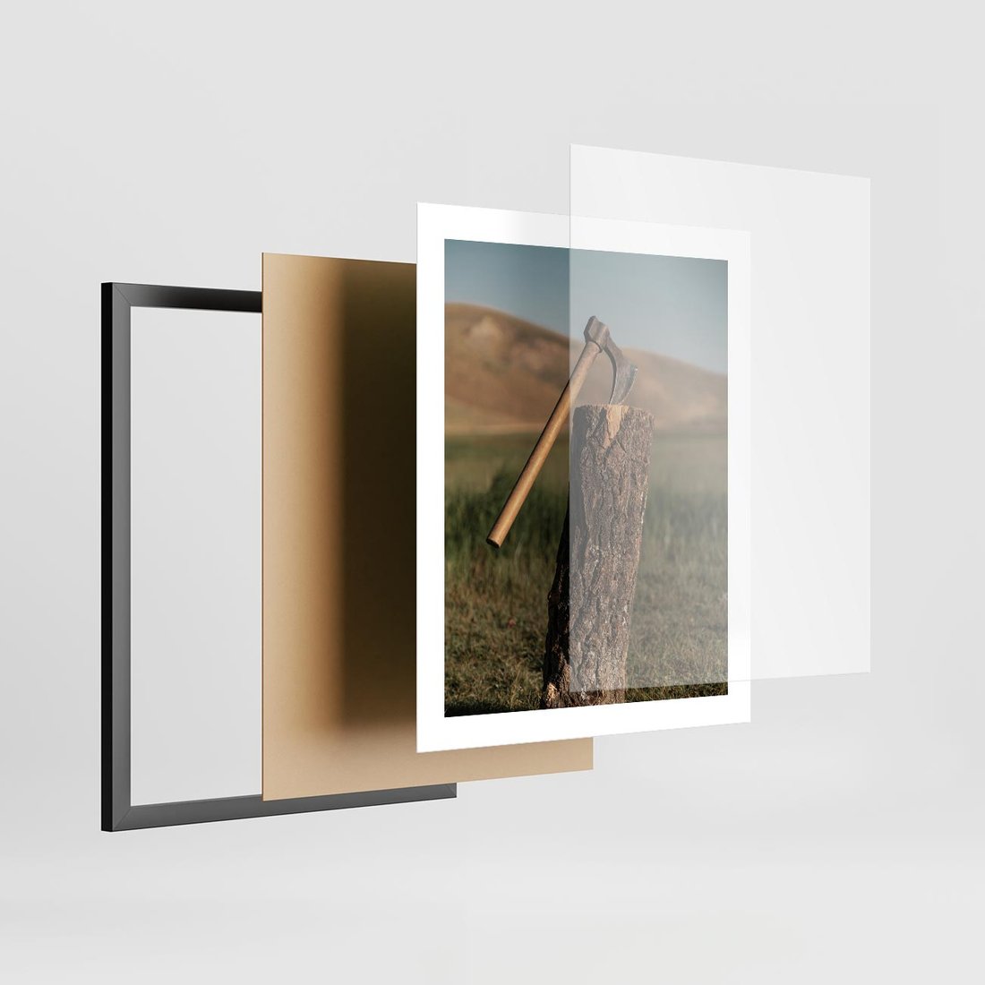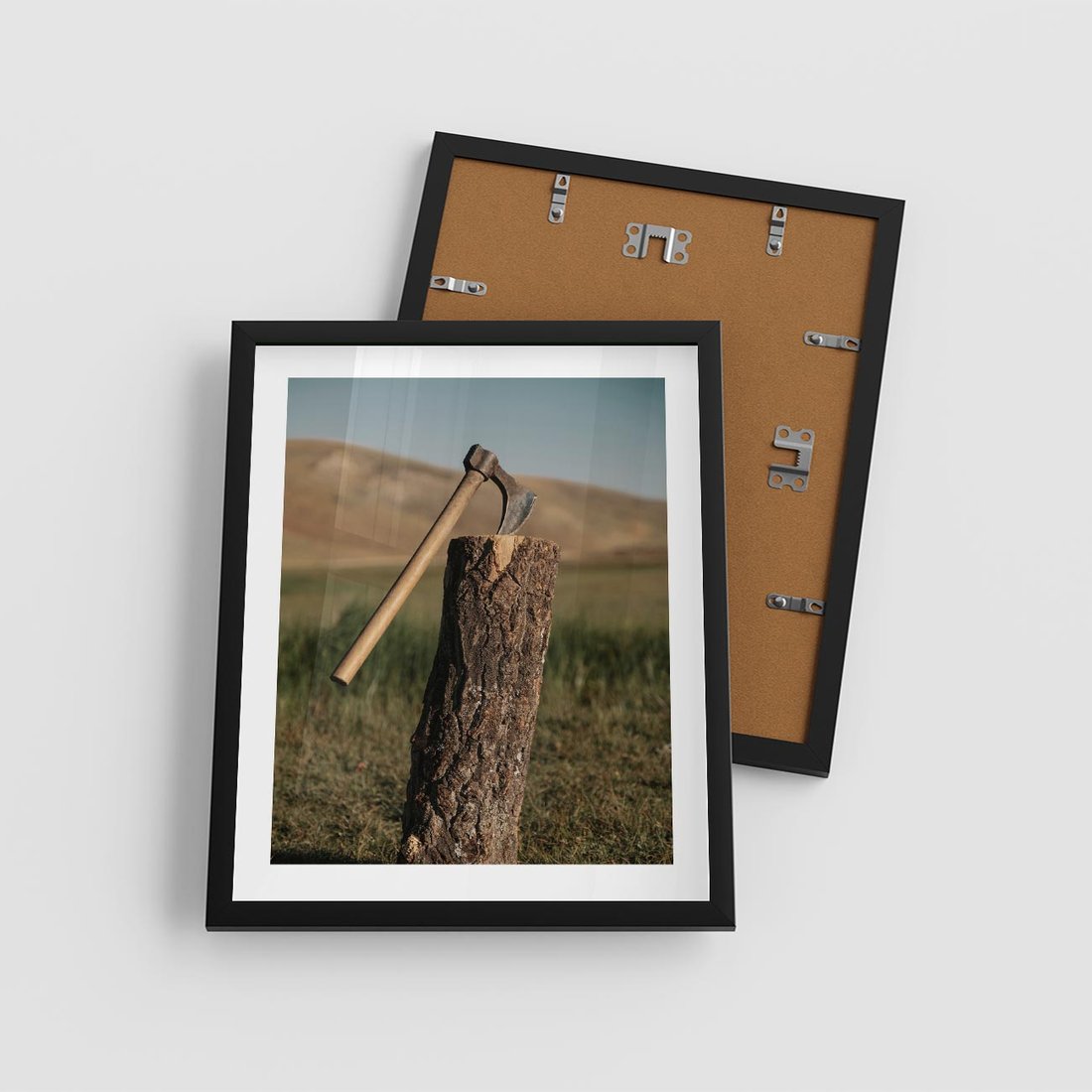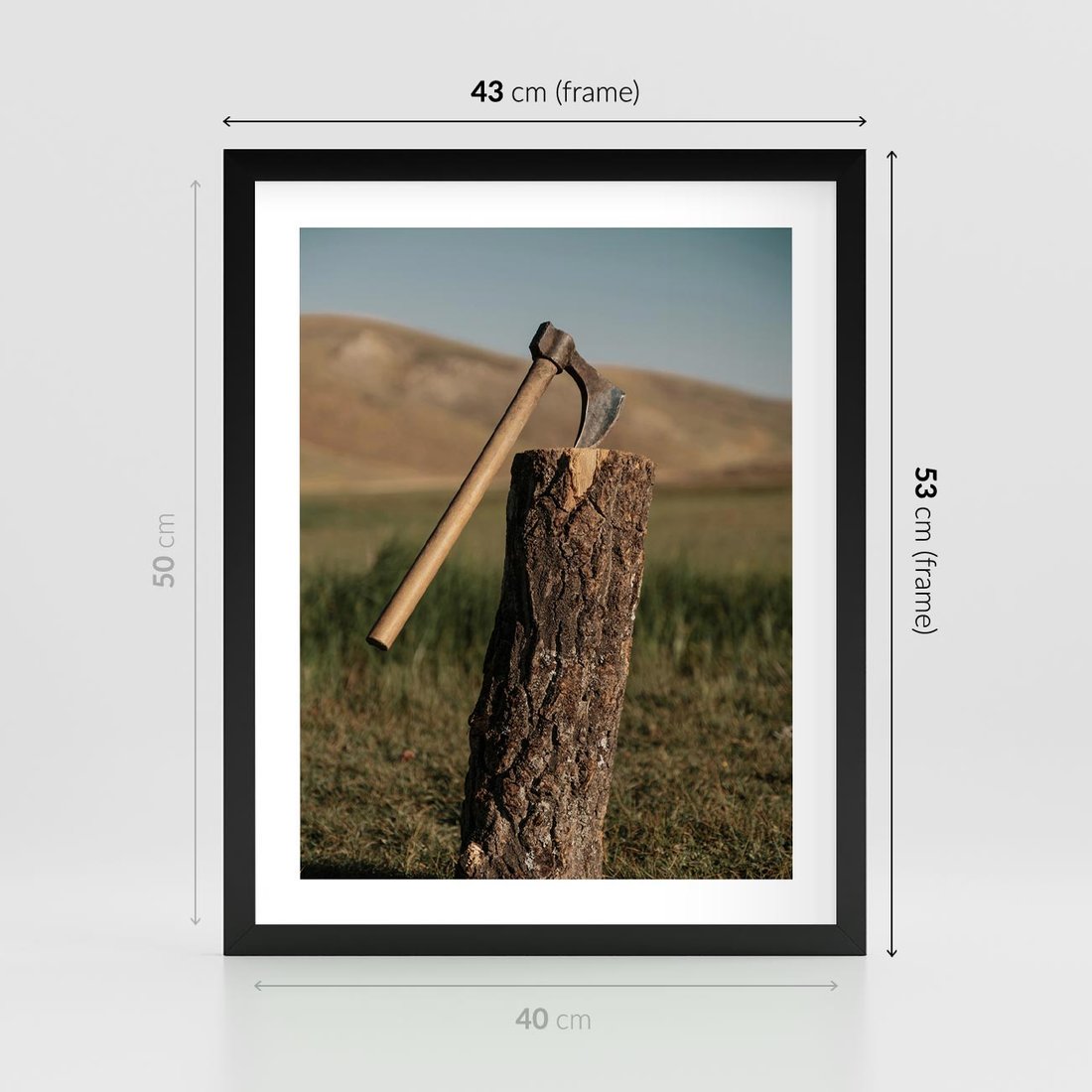 Plakat w ramie 40x50 - Lasowa siła w drewnie - las, siekiera - rama czarna
