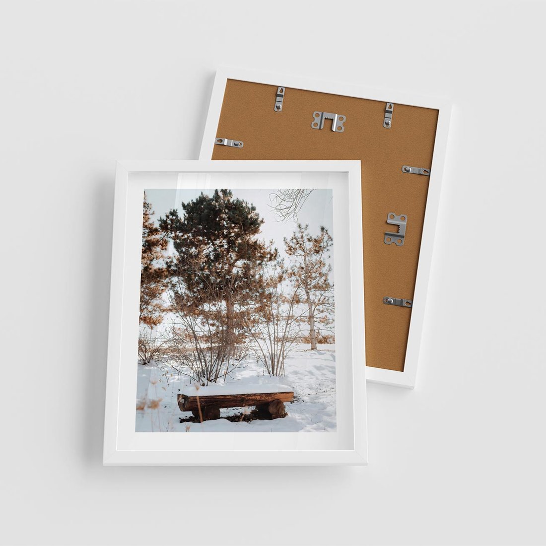 Plakat w ramie 40x50 - Ławka Pod Śniegiem - zimowy pejzaż, ławka pod śniegiem - rama biała