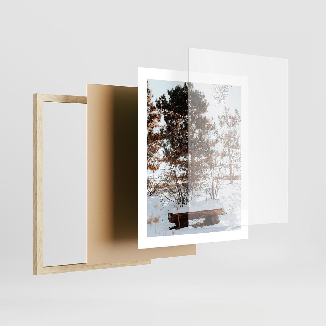 Plakat w ramie 40x50 - Ławka Pod Śniegiem - zimowy pejzaż, ławka pod śniegiem - rama drewno