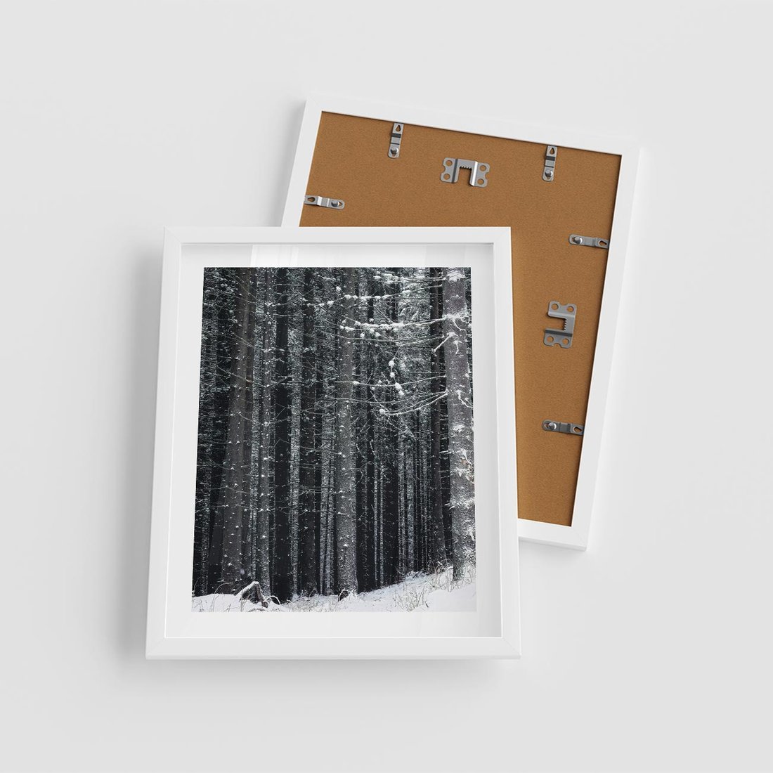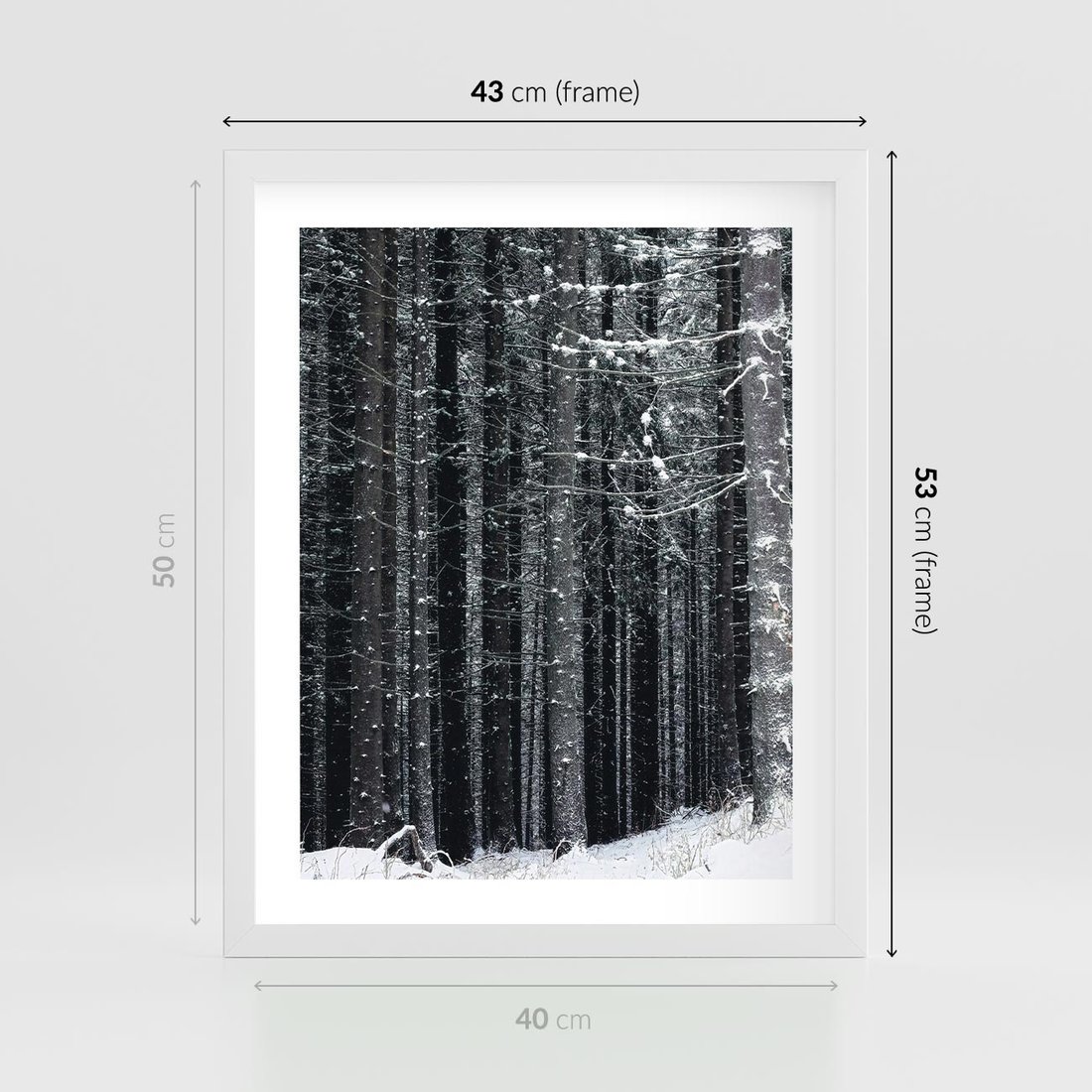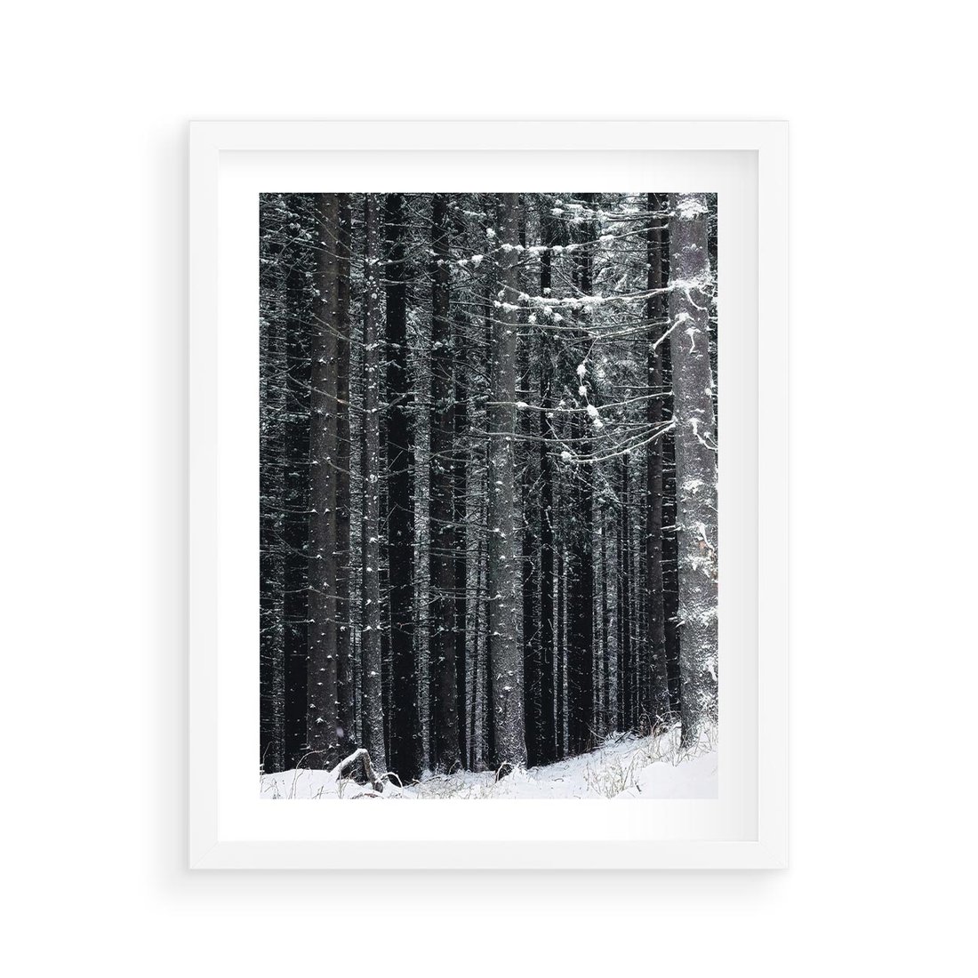 Plakat w ramie 40x50 - Leśna Cisza: Malowniczy Pejzaż Zimą - las zimą, ośnieżone pnie drzew - rama biała