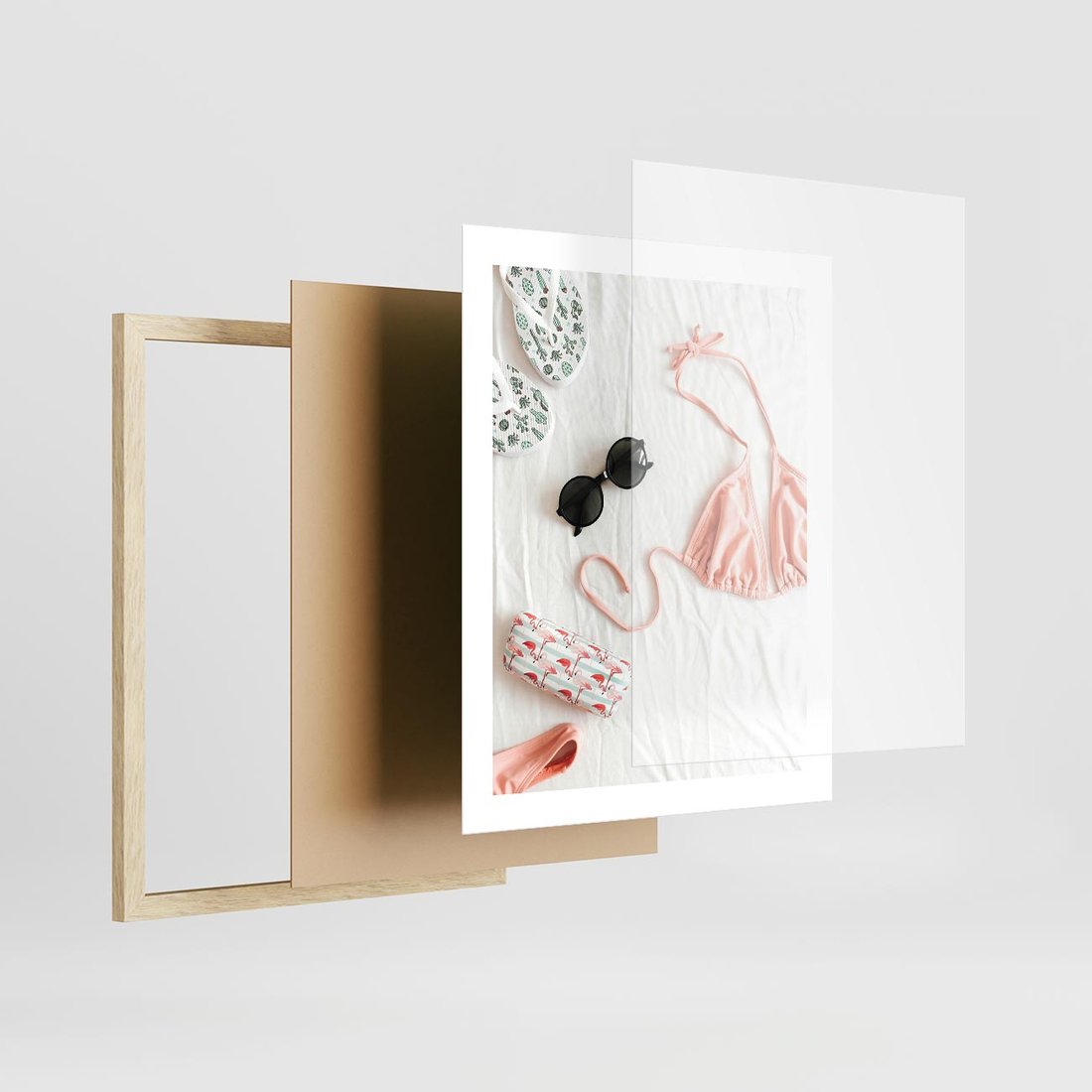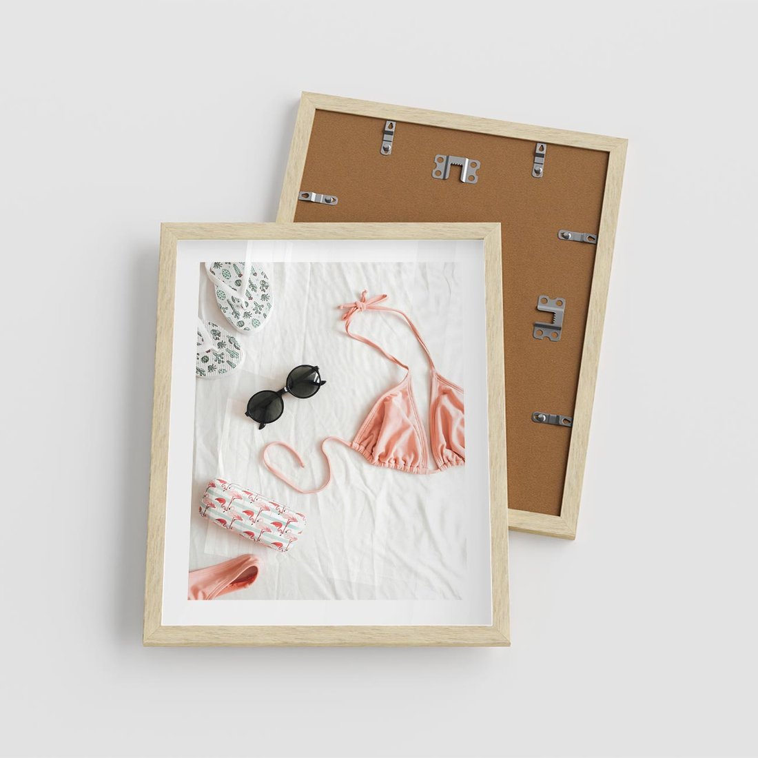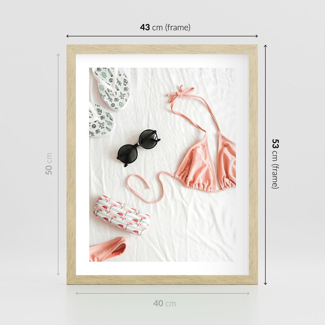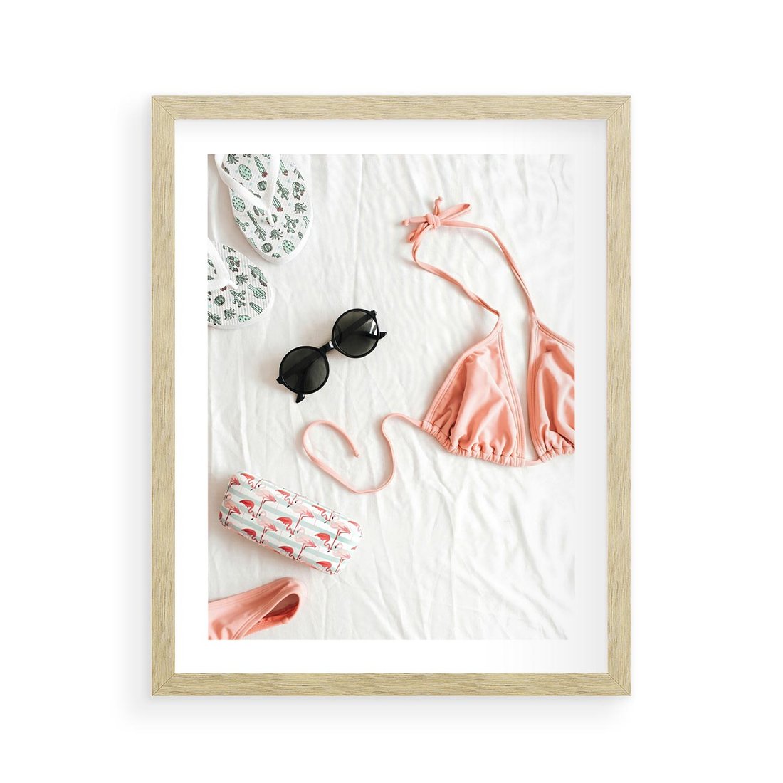 Plakat w ramie 40x50 - Letnia Elegancja na Plaży - kompozycja, elementy stroju na plażę - rama drewno