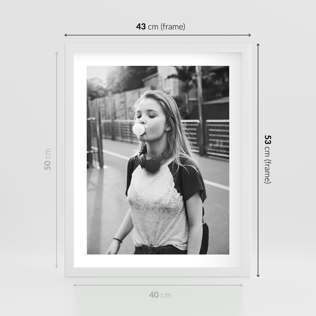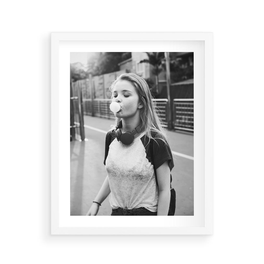 To nowoczesne czarno-białe zdjęcie przedstawia młodą dziewczynę w trakcie zabawy, gdzie robi balony z gumy. Zdjęcie ukazuje radość i beztroską chwilę młodości. Czarno-biała paleta kolorów dodaje zdjęciu elegancji i klasycznego wyglądu, a jednocześnie uchwyciła chwilę współczesności. To idealna fotografia do nowoczesnych wnętrz, które doceniają wyrażenie młodzieńczej radości i spontaniczności.