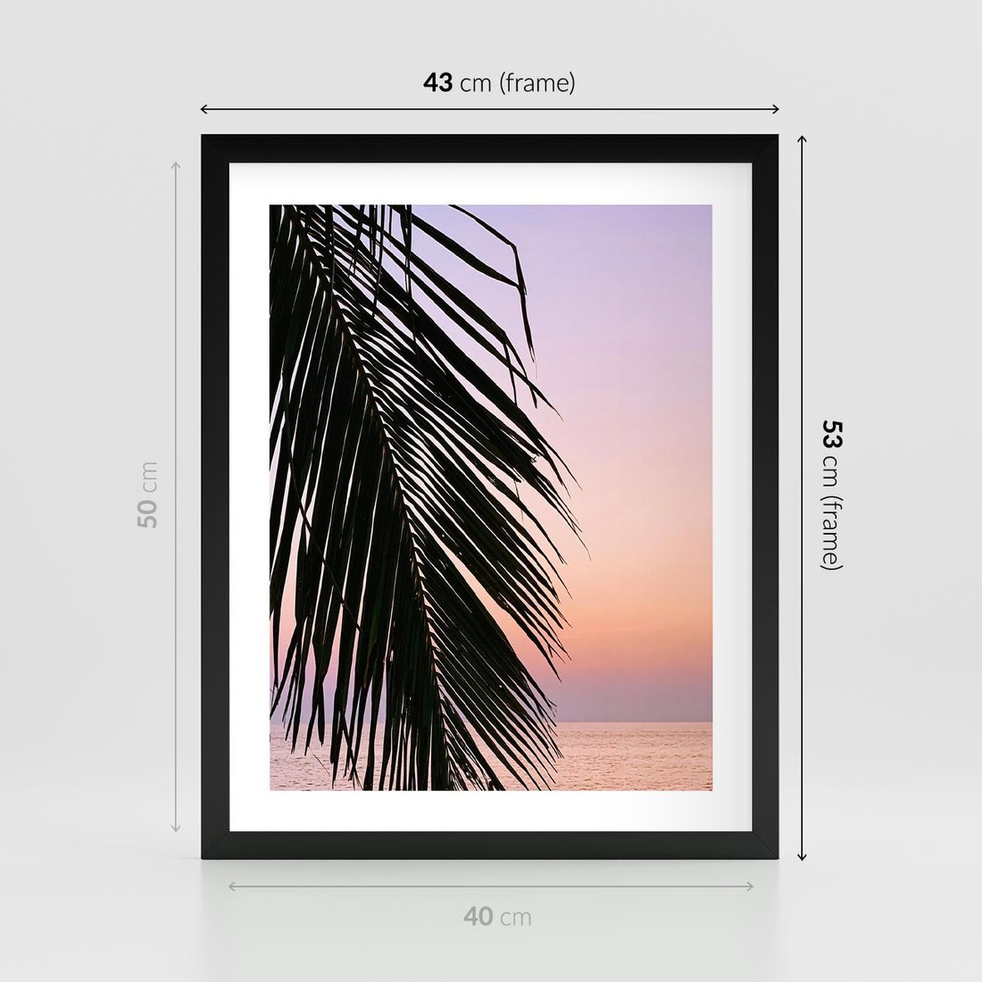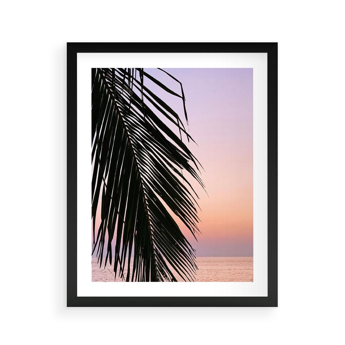 Plakat w ramie 40x50 - Liście Palmy nad Morzem - zachód słońca, liście palmy na tle nieba i morza - rama czarna