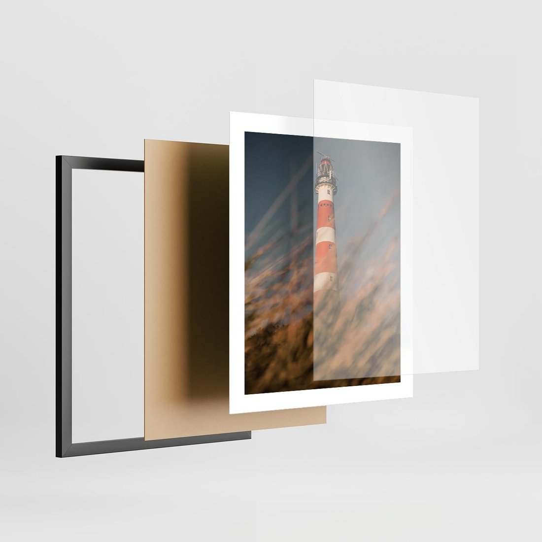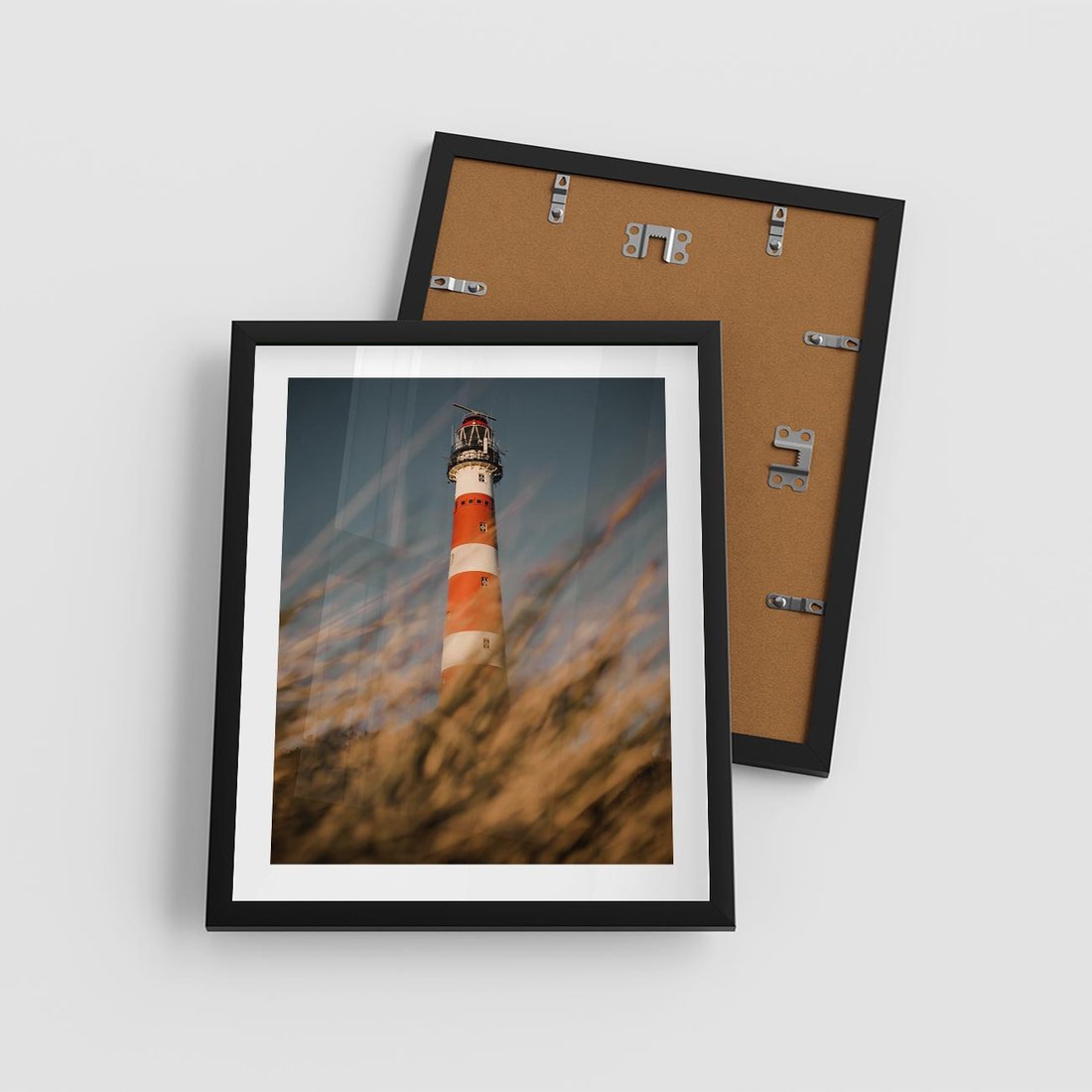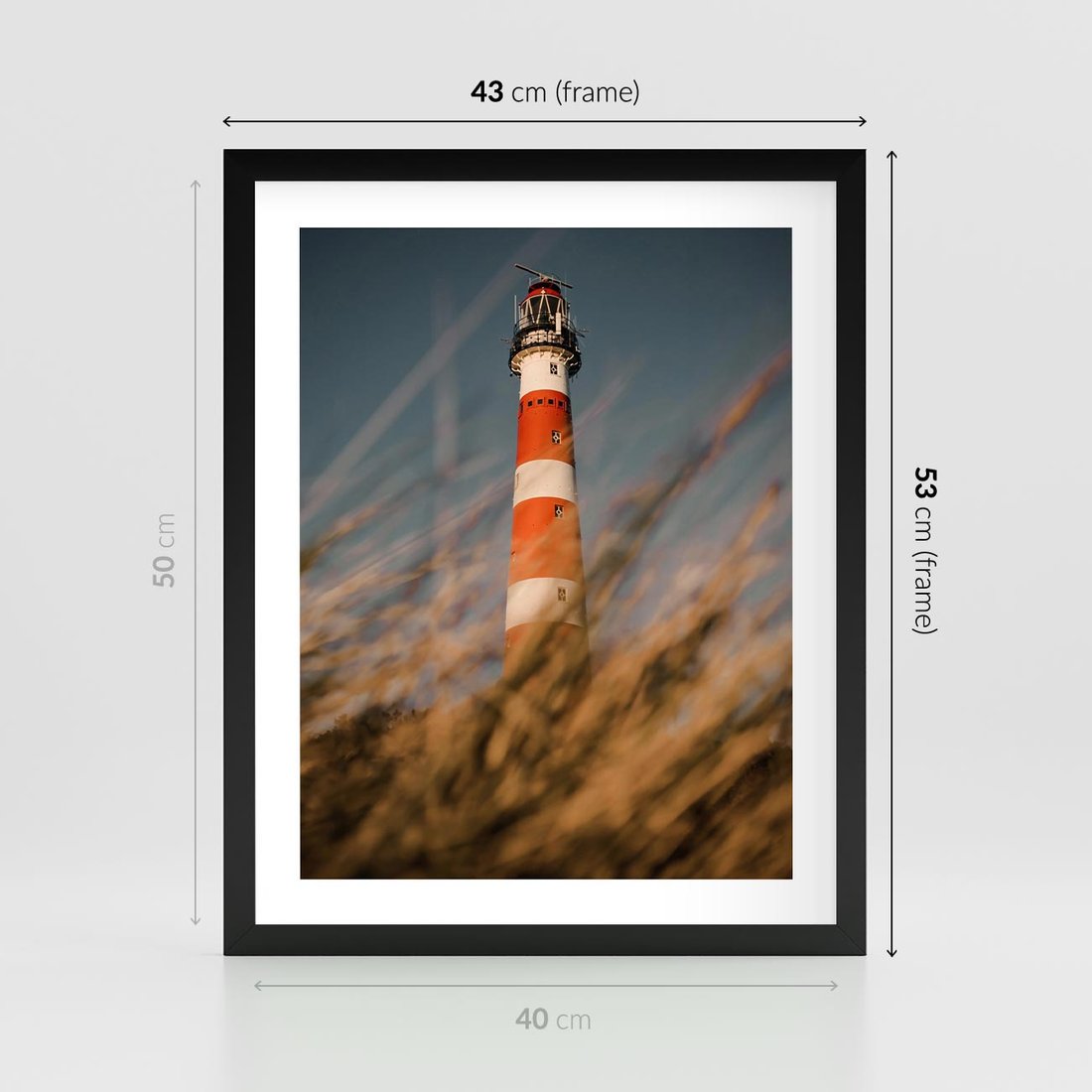 Plakat w ramie 40x50 - Magia nadmorskiego światła - latarnia morska, ujęcie z za trawy - rama czarna