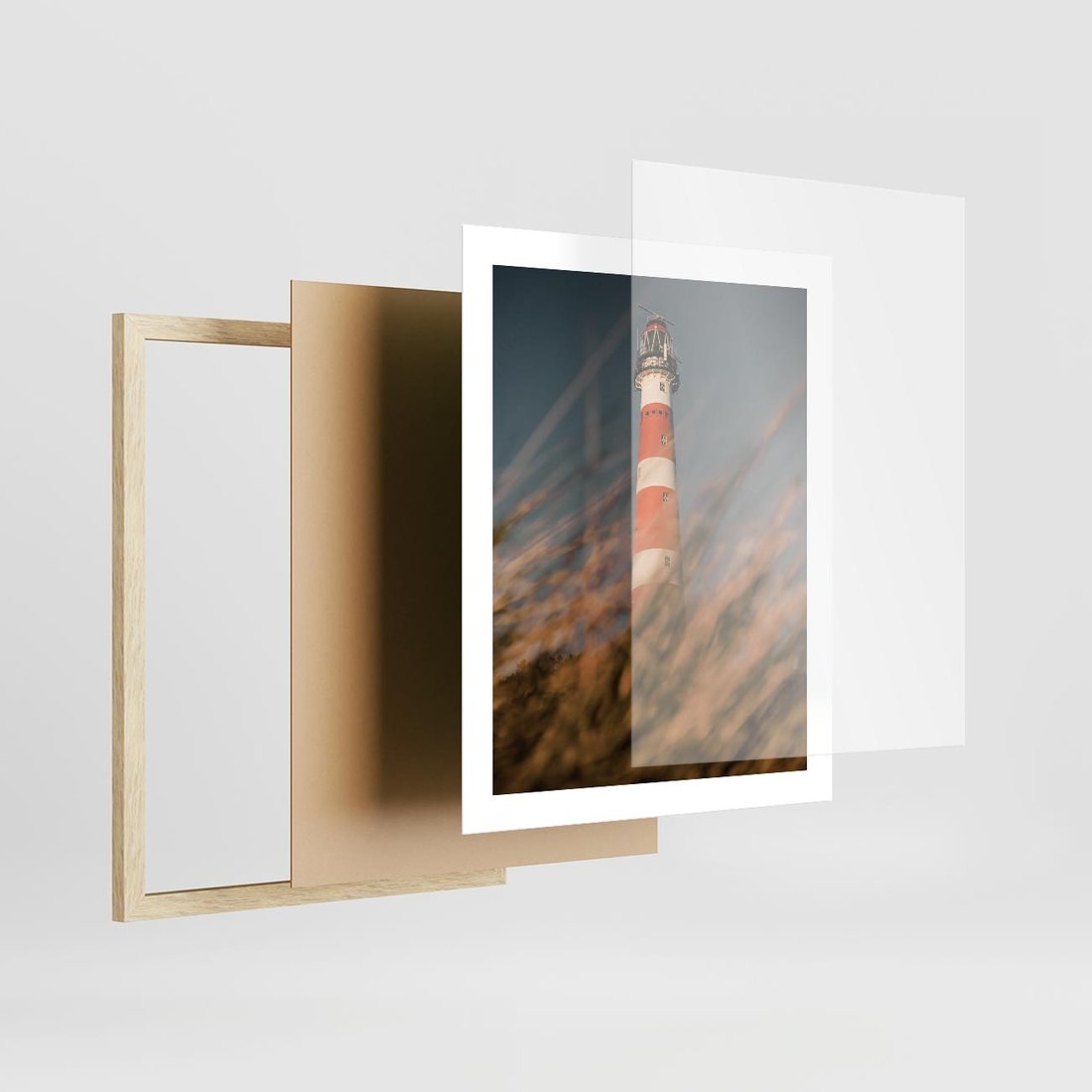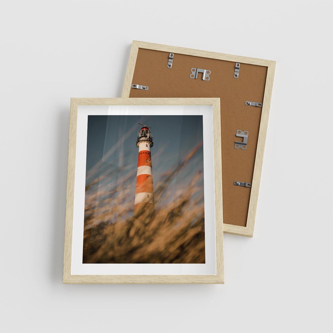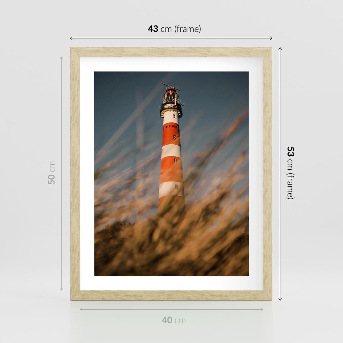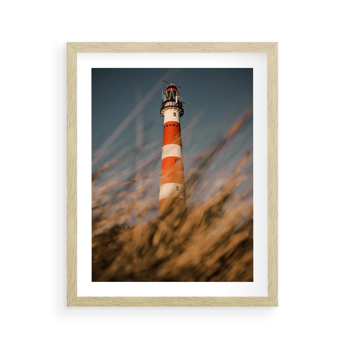 Plakat w ramie 40x50 - Magia nadmorskiego światła - latarnia morska, ujęcie z za trawy - rama drewno