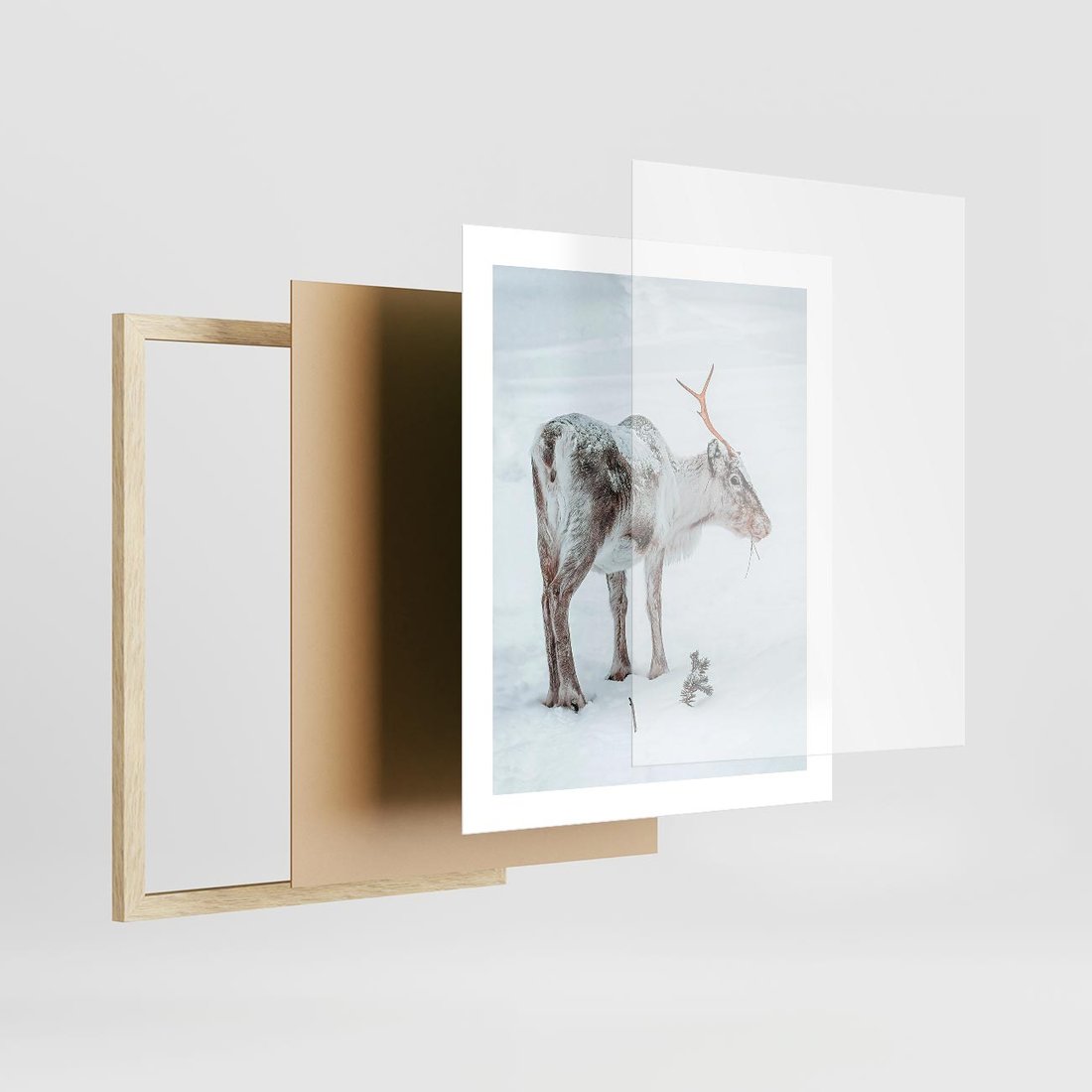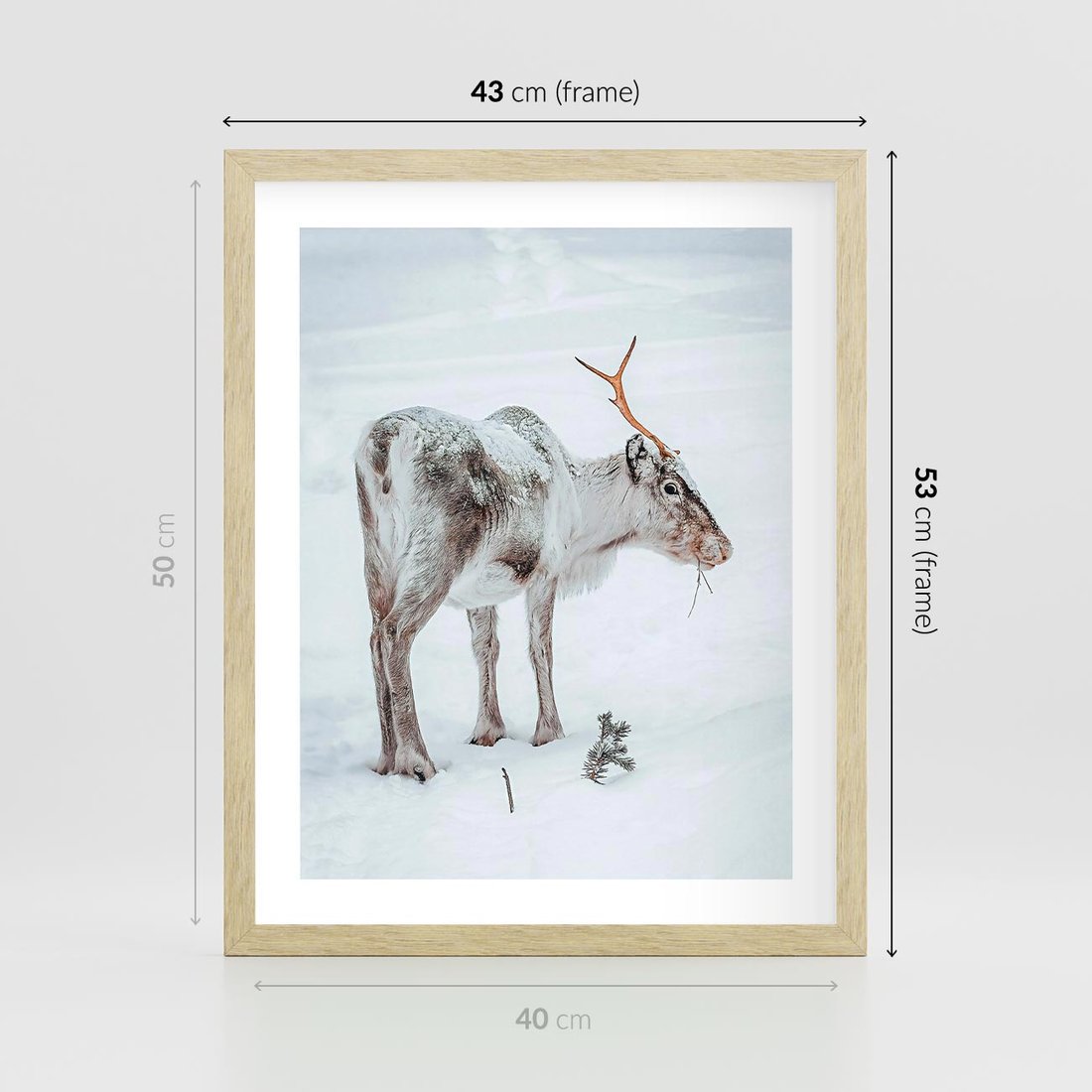 Plakat w ramie 40x50 - Magia Świąt - renifer na śniegu, śnieg - rama drewno