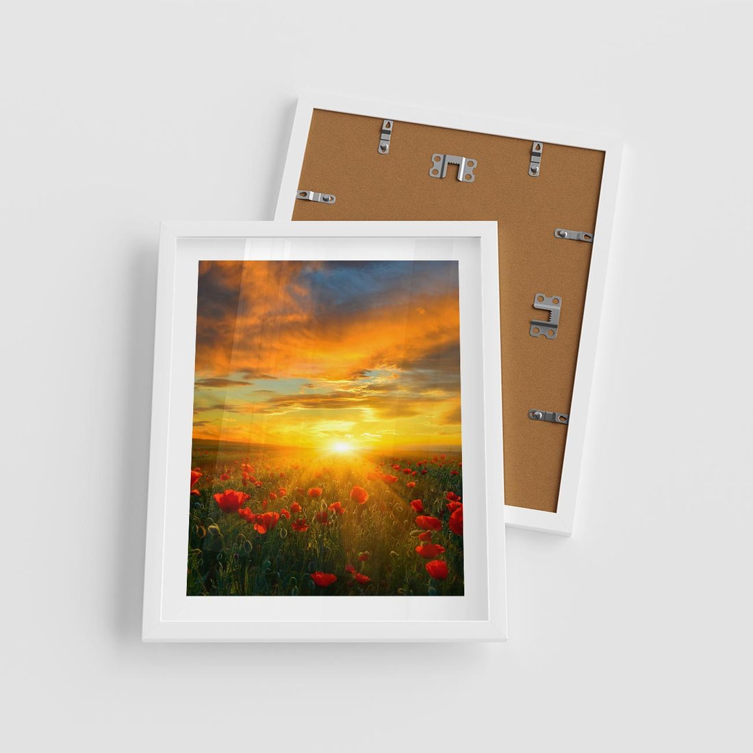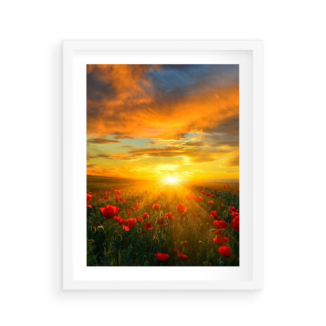 Plakat w ramie 40x50 - Magia zachodu słońca na łące z makami - łąka, zachód słońca - rama biała
