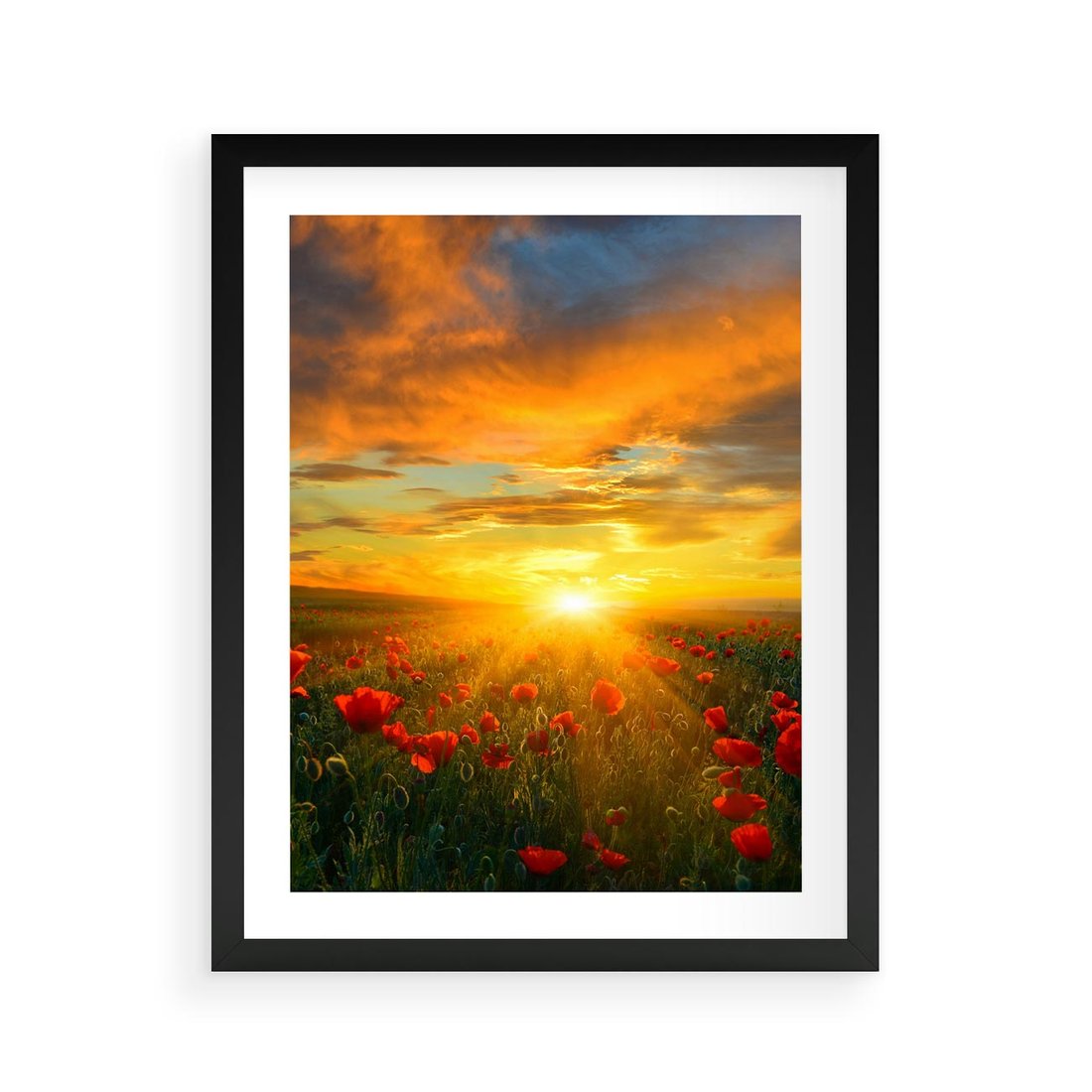 Ożyw swoje wnętrze tym ujmującym obrazem przedstawiającym magiczny zachód słońca na kolorowej łące pełnej maków. Soczyste kolory, delikatne płatki i złote promienie tworzą malowniczą kompozycję. Ten obraz dodaje romantyzmu i odczucia piękna natury, idealny dla miłośników zachodów słońca i kwiatów.