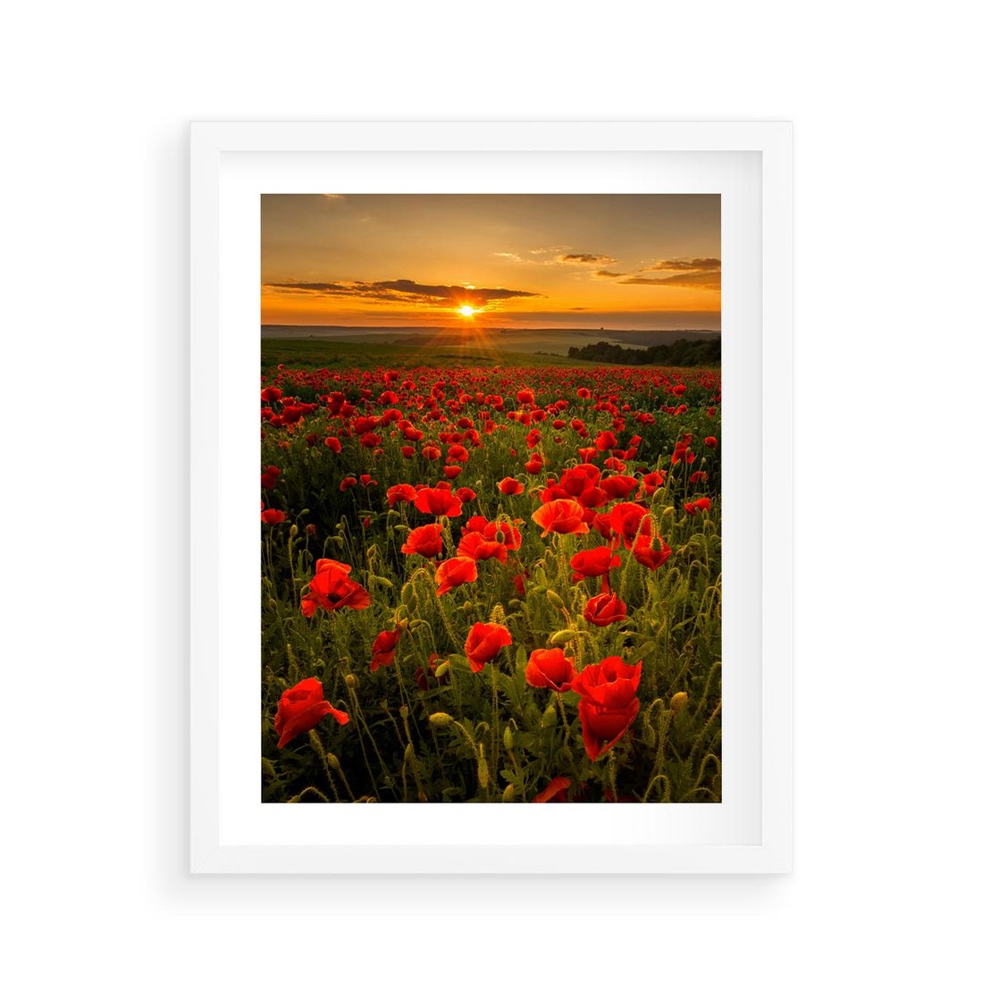 Plakat w ramie 40x50 - Maki przy zachodzie słońca - maki, zachód - rama biała