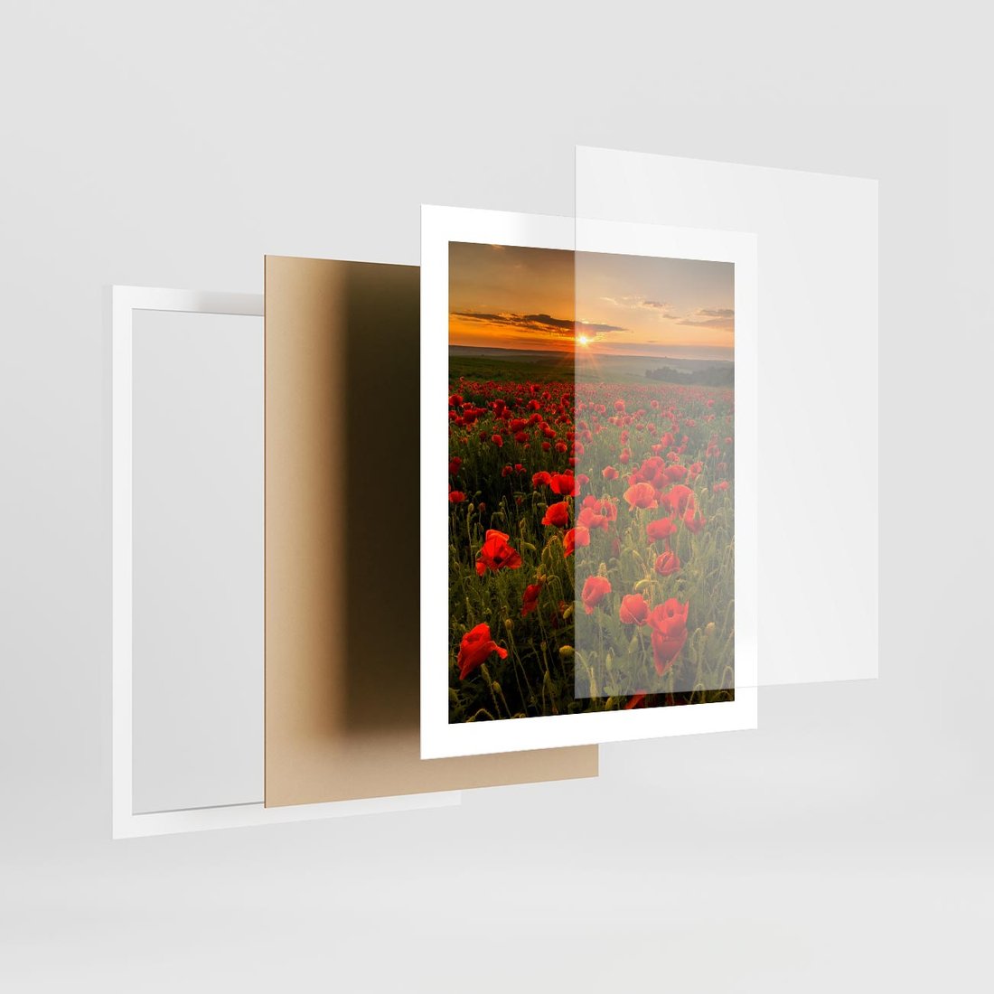 Ożyw swoje wnętrze tym uroczym obrazem przedstawiającym maki przy zachodzie słońca. Ich intensywne czerwone płatki, złote promienie i romantyczny klimat tworzą malowniczą kompozycję. Ten obraz dodaje odczucia piękna natury.