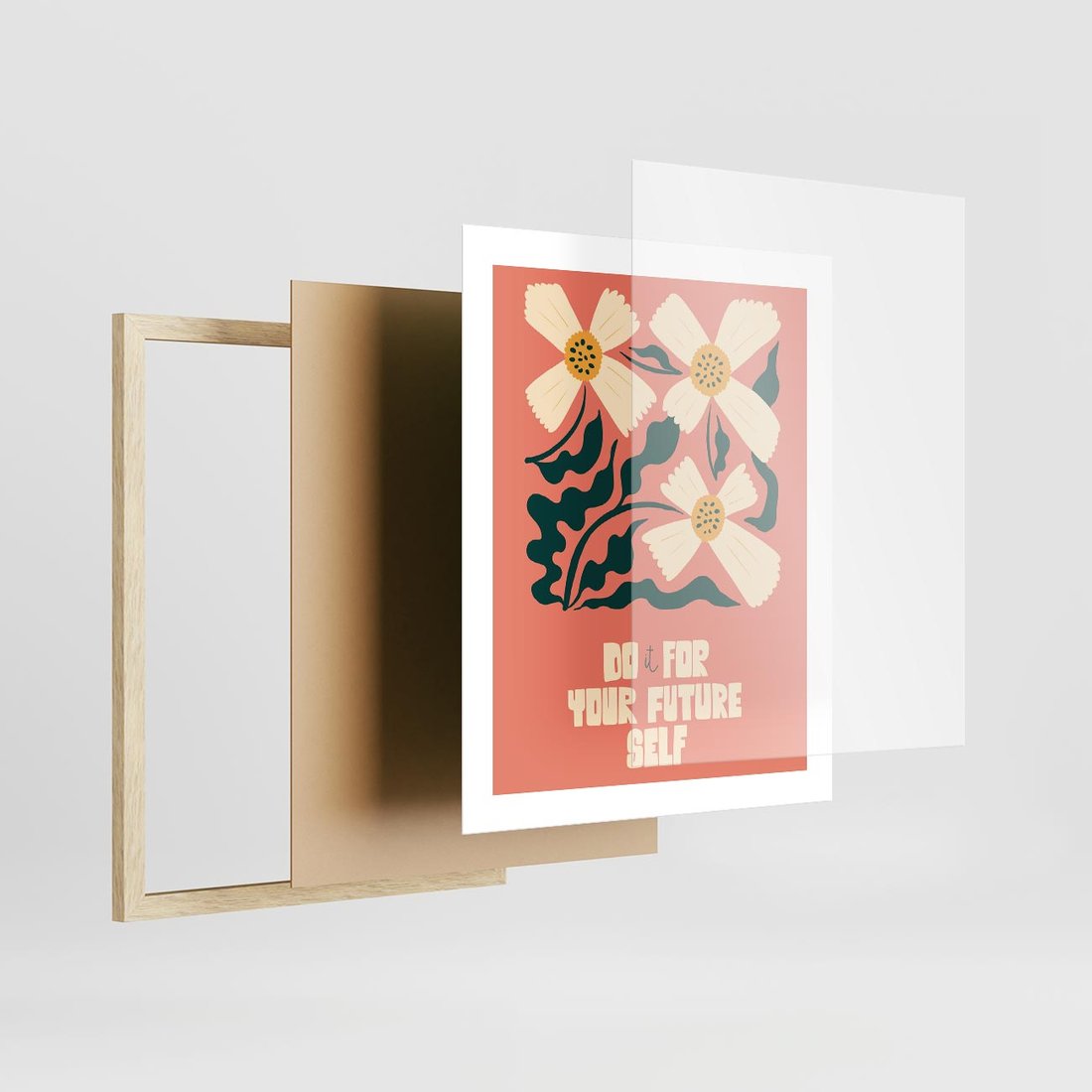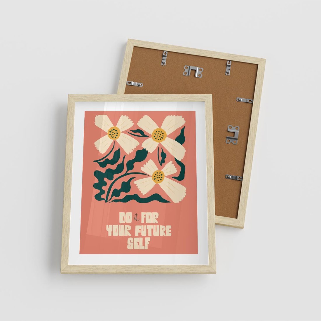 Ten nowoczesny plakat przenosi nas w styl retro, prezentując białe stokrotki na delikatnym różowym tle. Kompozycja łączy w sobie klasykę i nowoczesność, tworząc wyjątkową harmonię wzorów i kolorów.