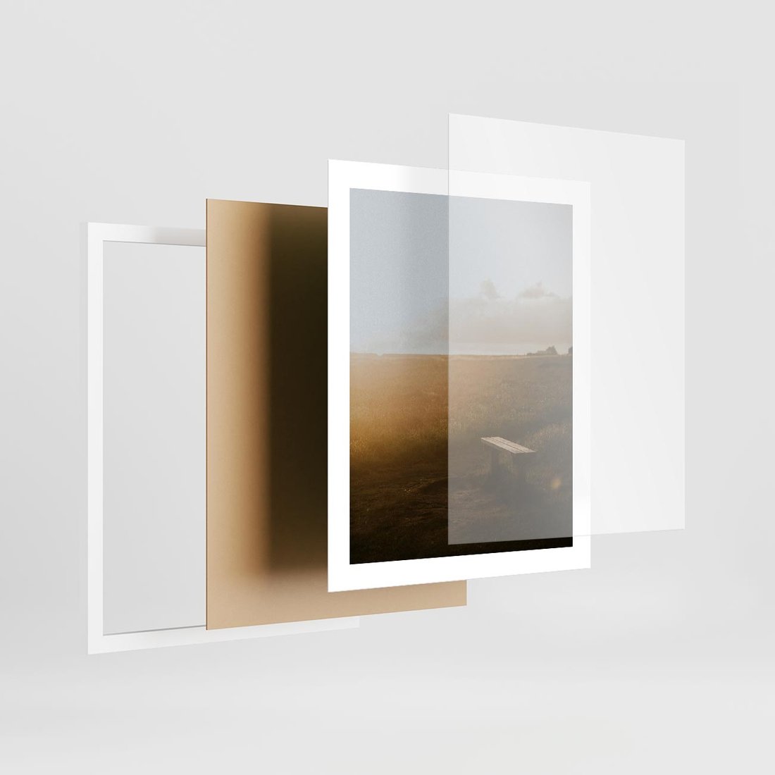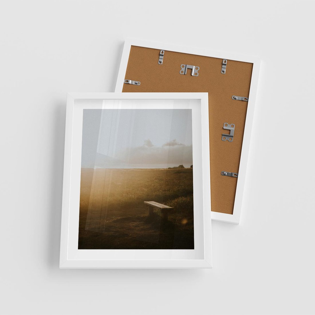 Plakat w ramie 40x50 - Mglisty zachód słońca na ławeczce - mgła, zachód - rama biała