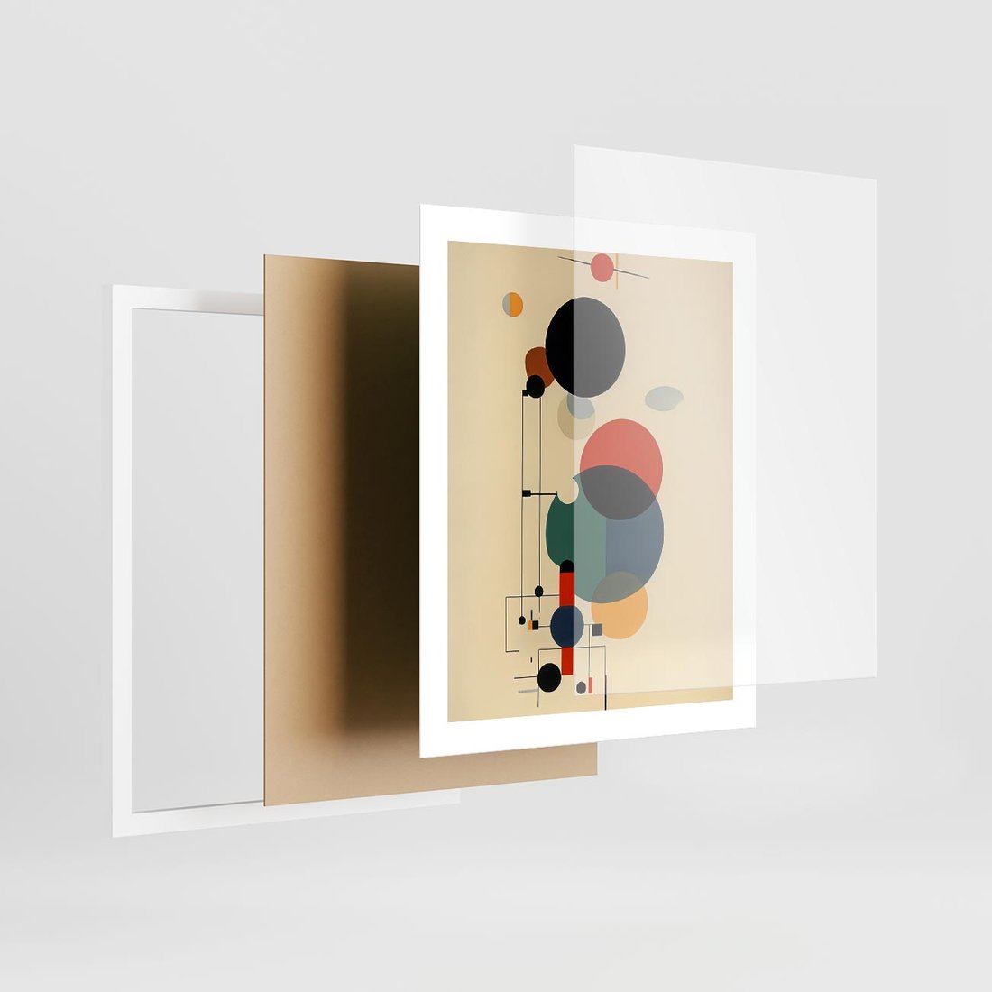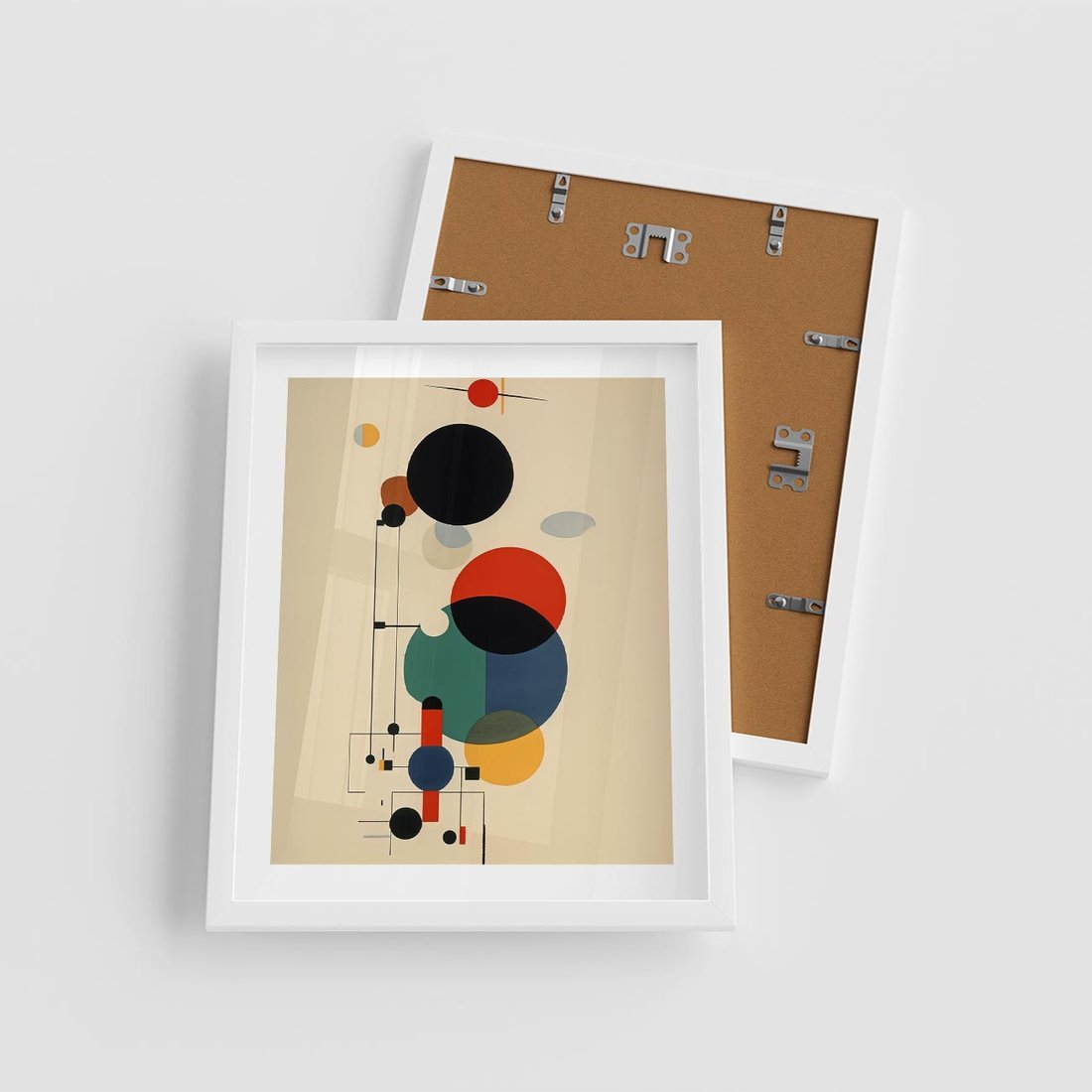 Ta abstrakcyjna geometryczna kompozycja inspirowana stylem Kandinsky'ego łączy w sobie elementy kół i linii, tworząc dynamiczną i ekspresyjną wizję. Ten wpływ dodaje głębi i emocji temu obrazowi.