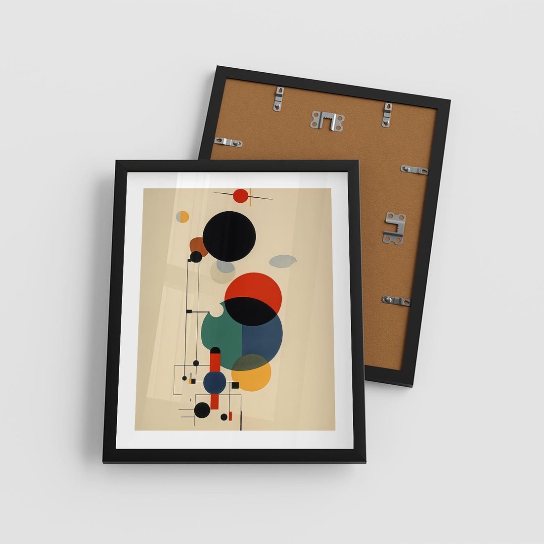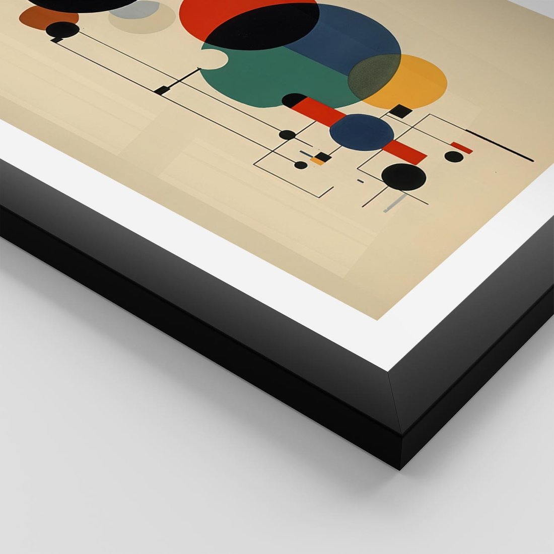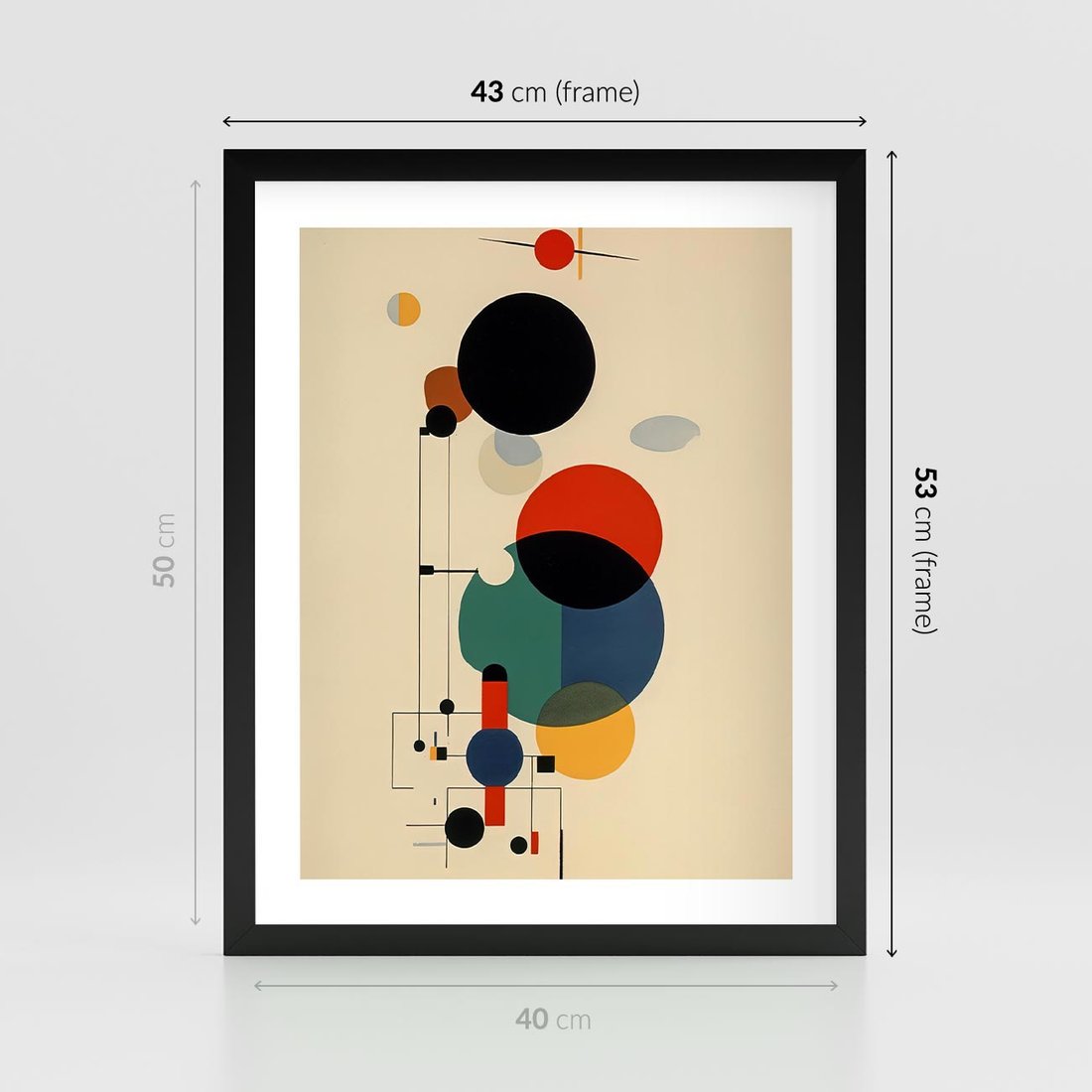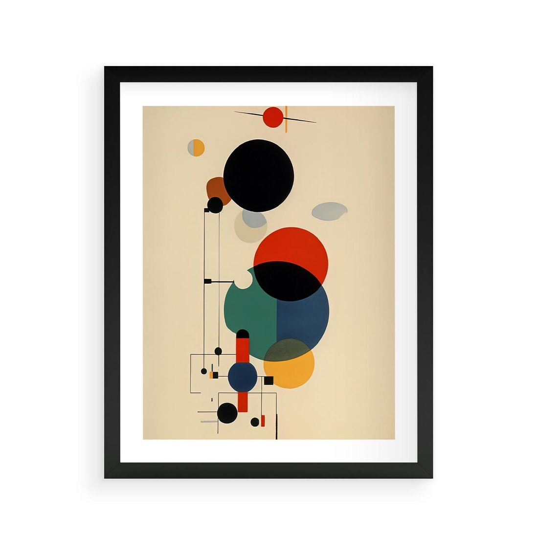 Ta abstrakcyjna geometryczna kompozycja inspirowana stylem Kandinsky'ego łączy w sobie elementy kół i linii, tworząc dynamiczną i ekspresyjną wizję. Ten wpływ dodaje głębi i emocji temu obrazowi.