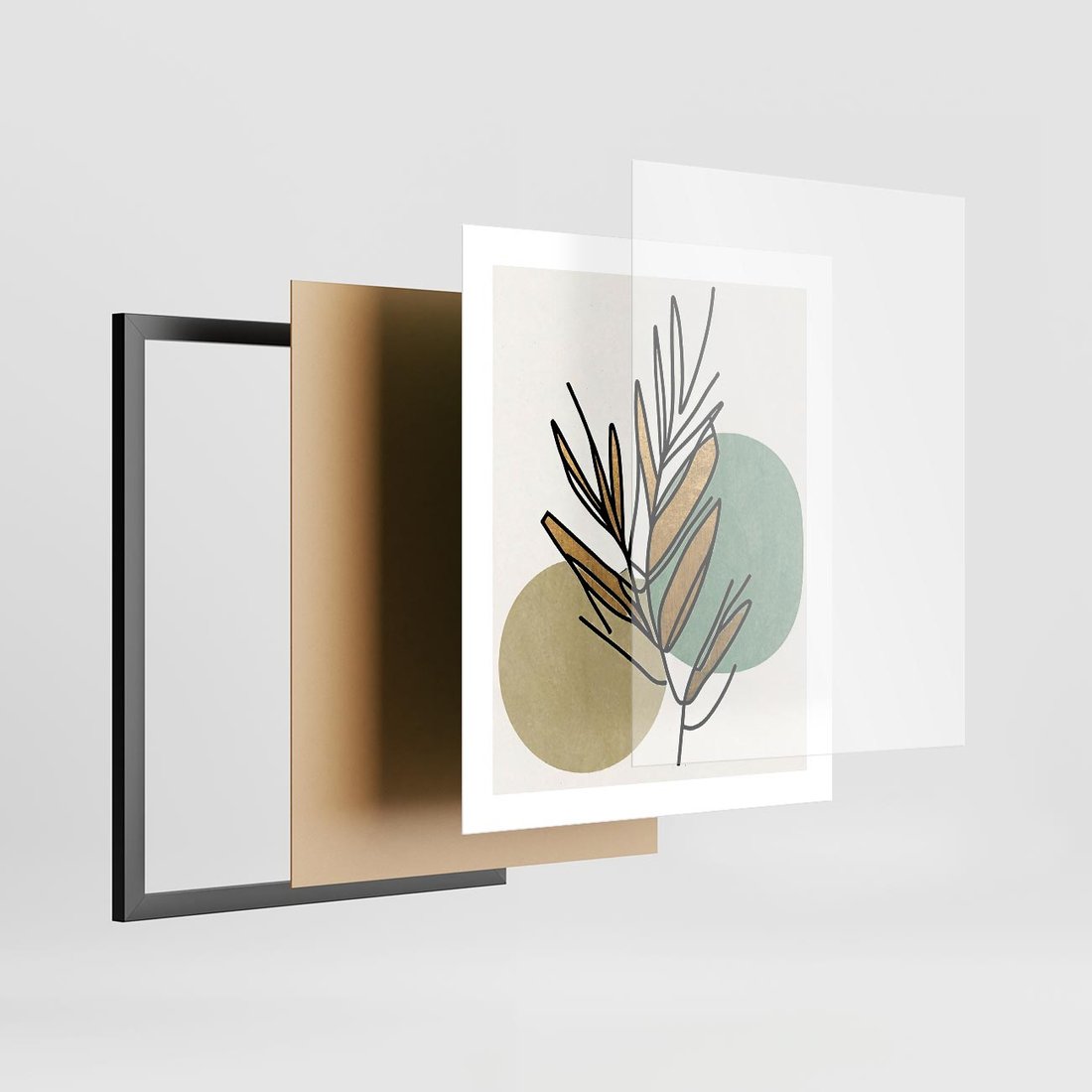 Plakat w ramie 40x50 - Migocące Ścieżki Wizji - abstrakcyjny obraz boho, liście - rama czarna