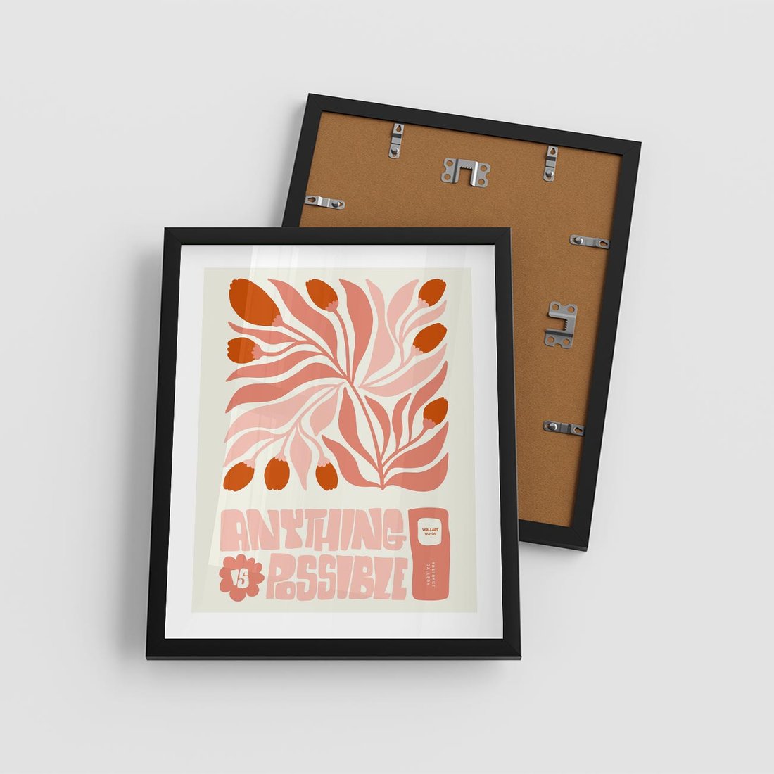 Ta nowoczesna sztuka przedstawia kompozycję w ciepłym łososiowym kolorze, z abstrakcyjnymi kwiatami i wyrazistą typografią. Tworzy ona piękną równowagę między naturą a sztuką, emanując spokojem i elegancją.