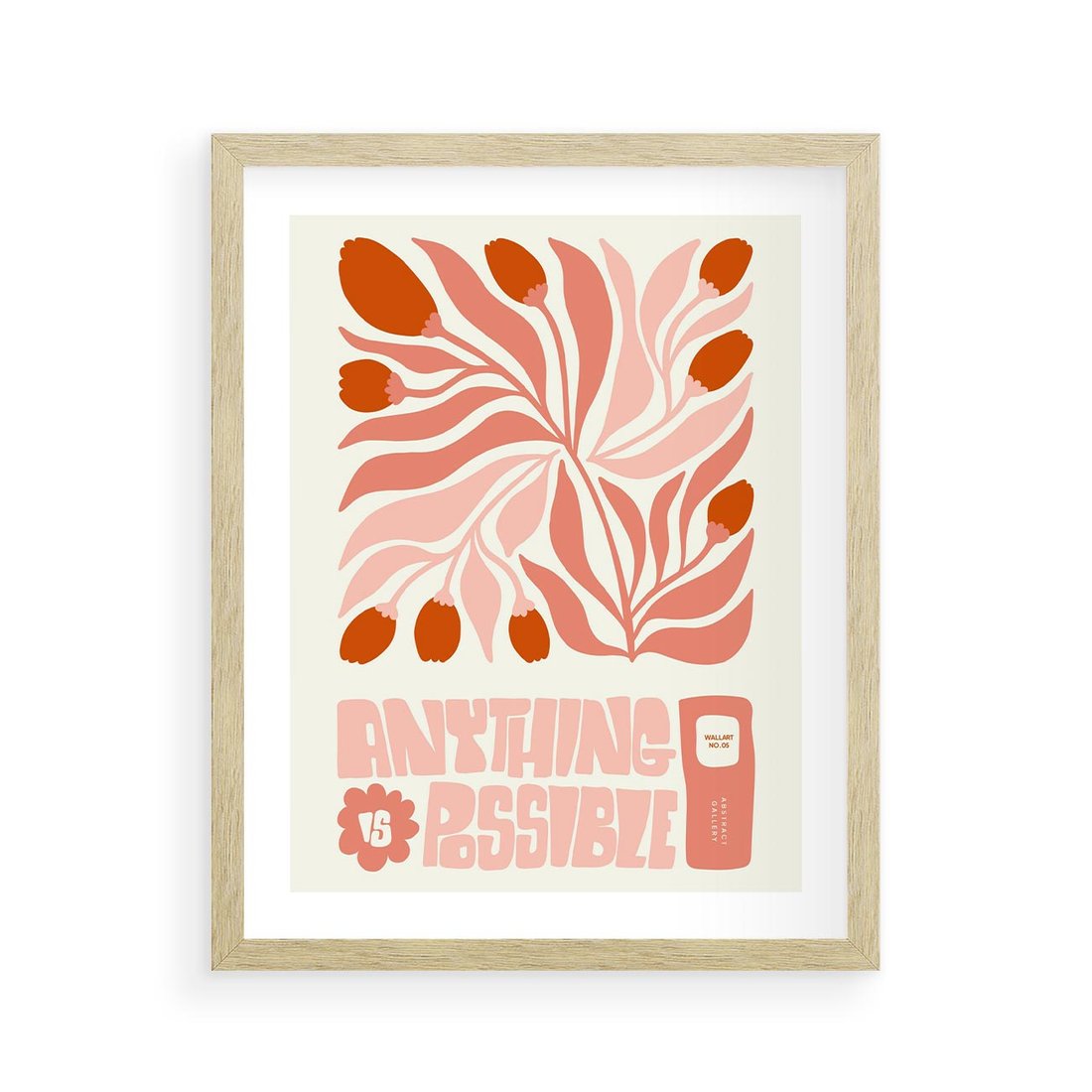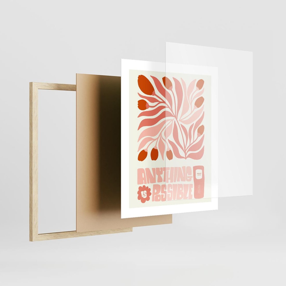 Ta nowoczesna sztuka przedstawia kompozycję w ciepłym łososiowym kolorze, z abstrakcyjnymi kwiatami i wyrazistą typografią. Tworzy ona piękną równowagę między naturą a sztuką, emanując spokojem i elegancją.