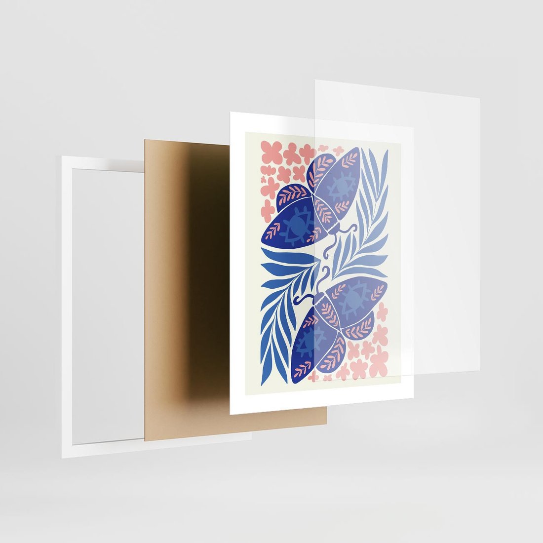 Ten nowoczesny plakat przedstawia abstrakcyjne spotkanie między kwiatami a ćmami, łącząc białe tło z delikatnym pastelowym różem i granatem. Sztuka ta tworzy niezwykłe połączenie natury i abstrakcji, zachęcając do refleksji nad relacjami między różnymi elementami świata.