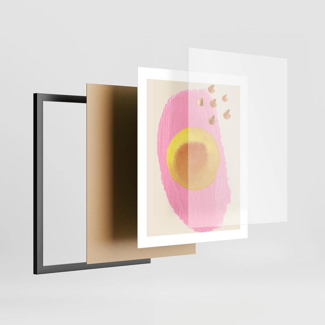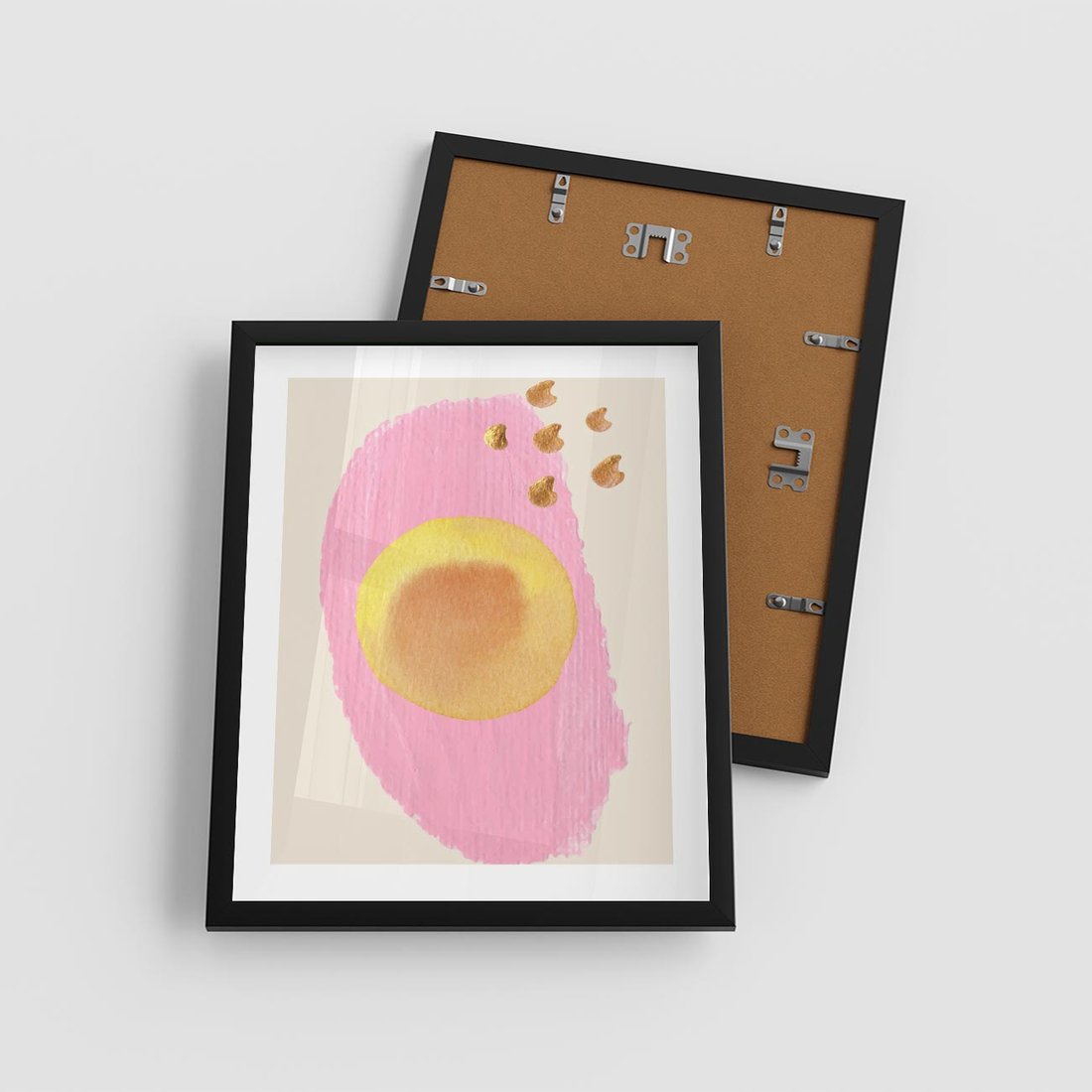 Nasz minimalistyczny plakat to abstrakcyjna różowa plama w akwarelowej technice, zdobiona subtelnie złotymi plamami. To wyjątkowe dzieło sztuki wprowadzi delikatność i elegancję do Twojej przestrzeni, zachwycając wyrafinowaną prostotą i subtelnością.