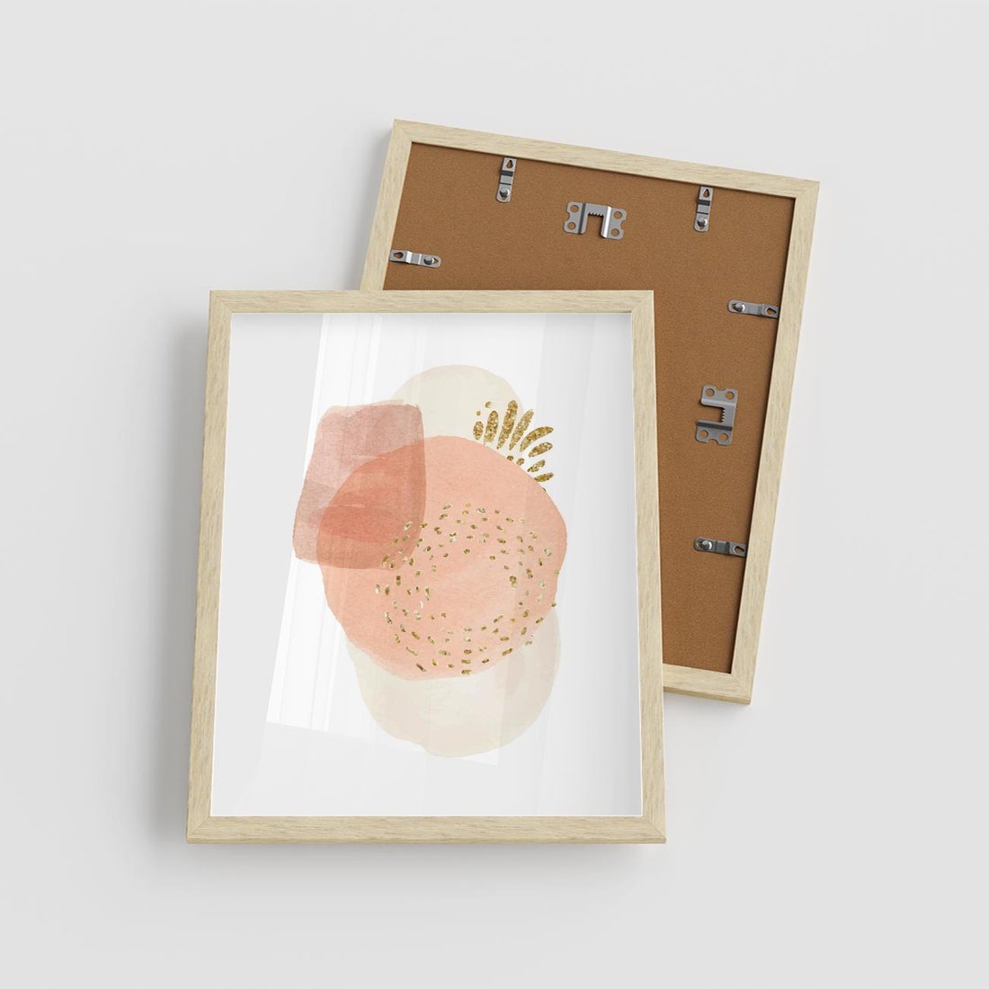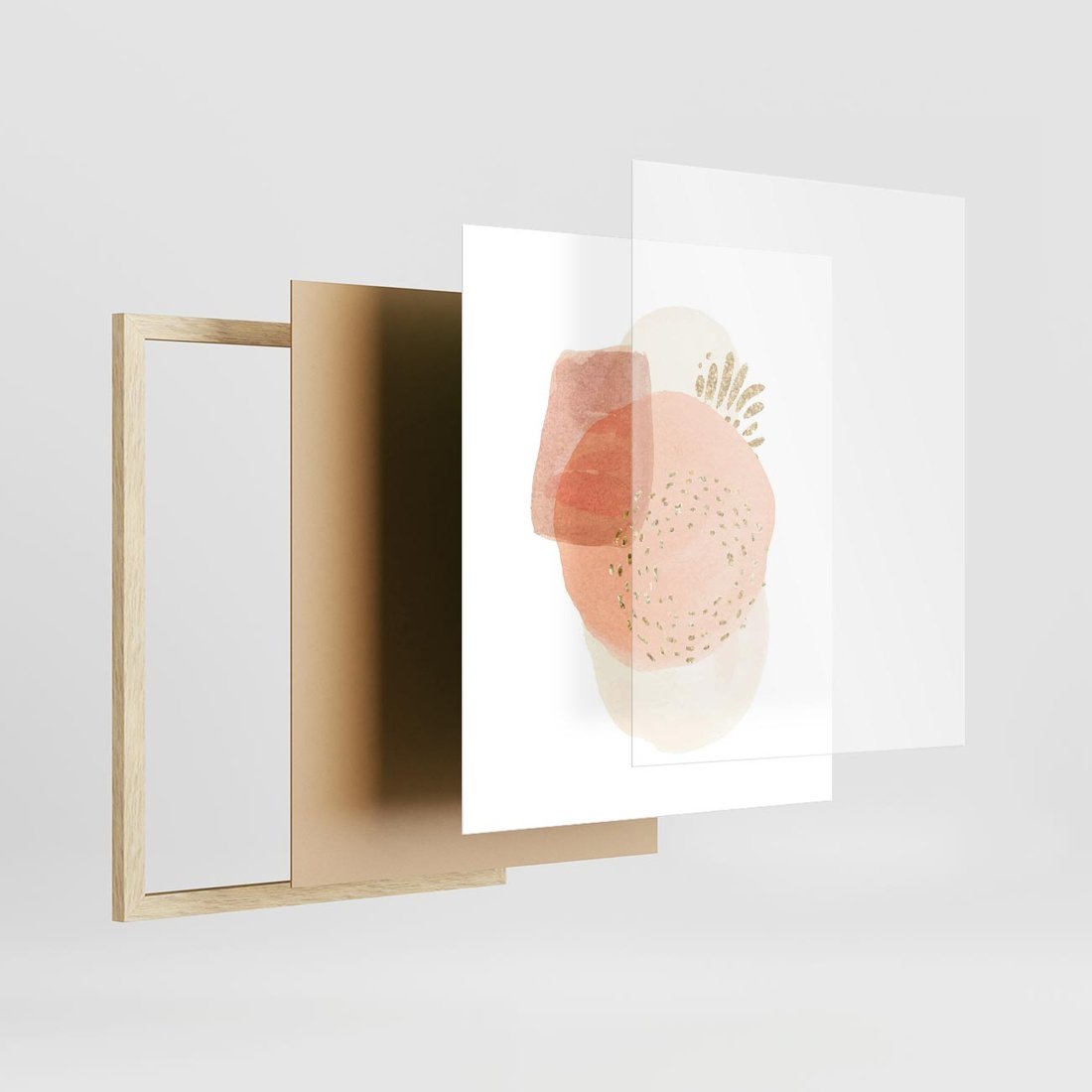 Minimalistyczna kompozycja abstrakcyjnych akwarelowych plam w stonowanych pastelach, ozdobiona subtelnie złotymi elementami. To wyrafinowane dzieło sztuki, które w prostocie wyraża piękno i harmonię.