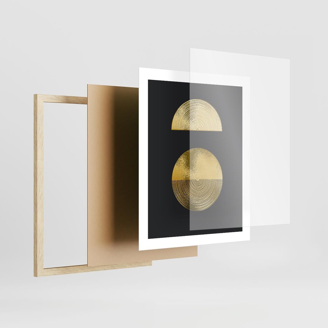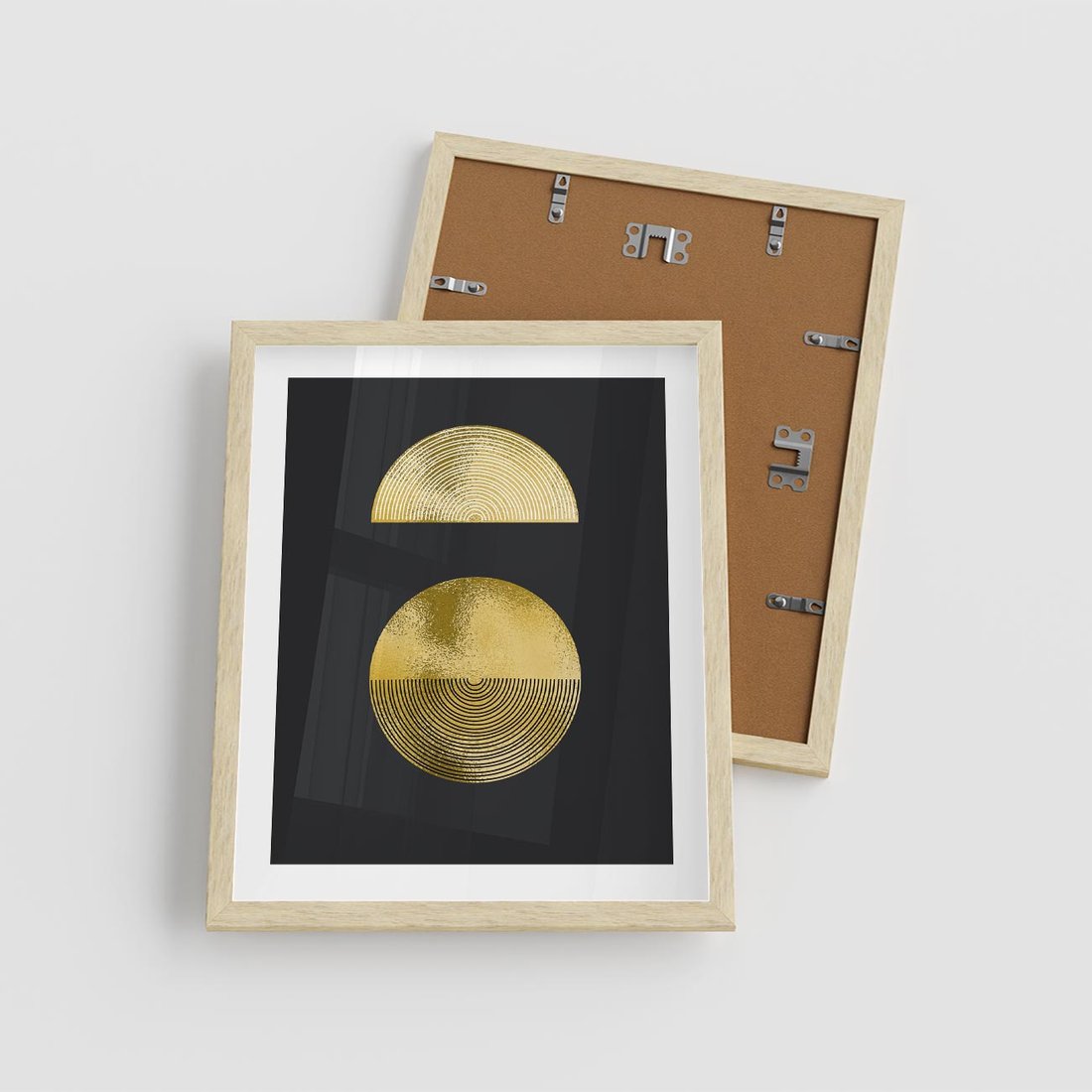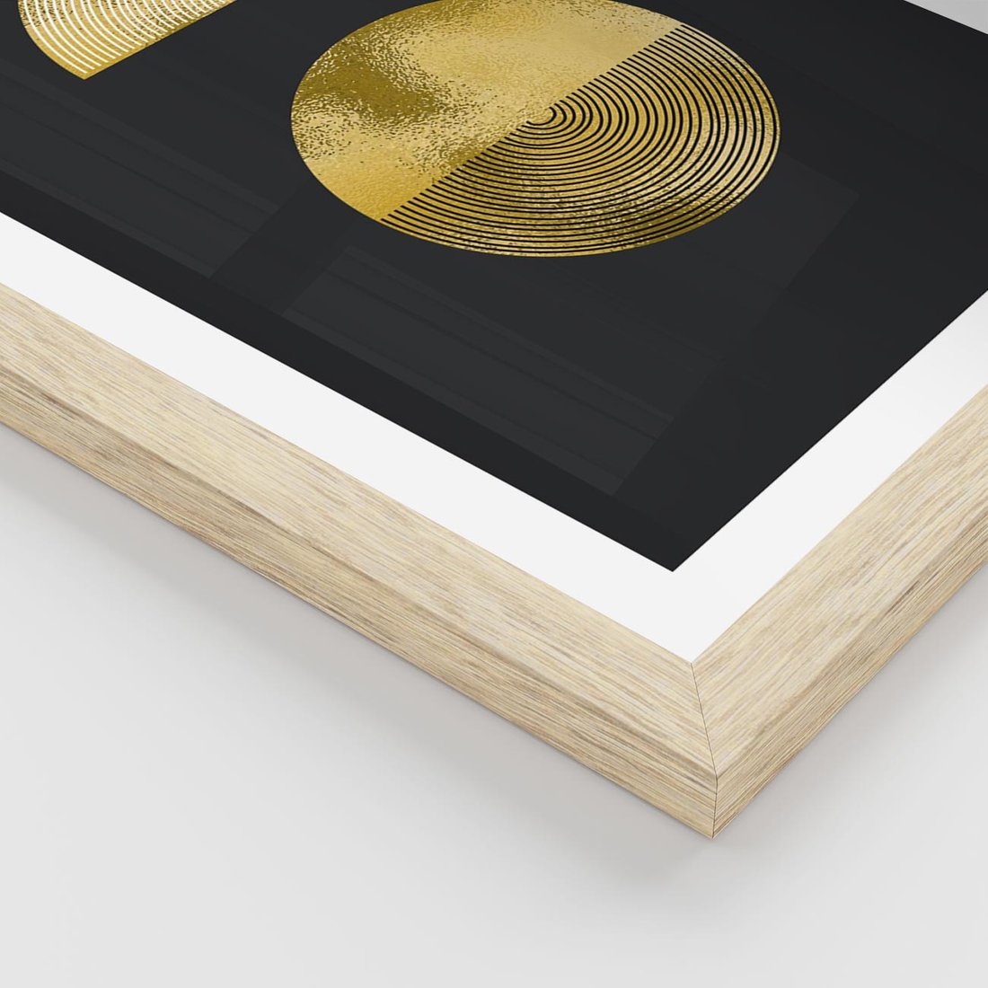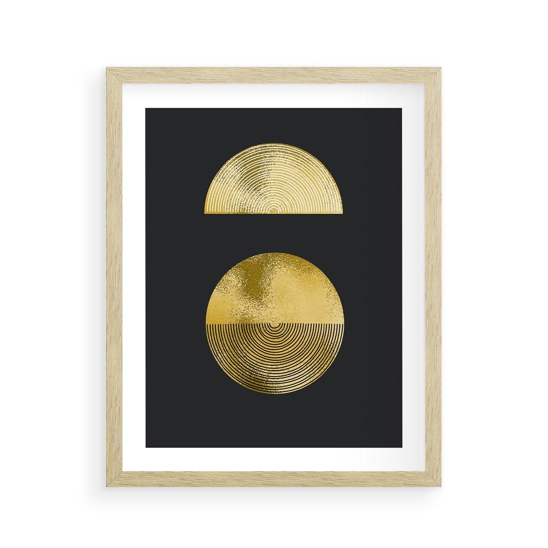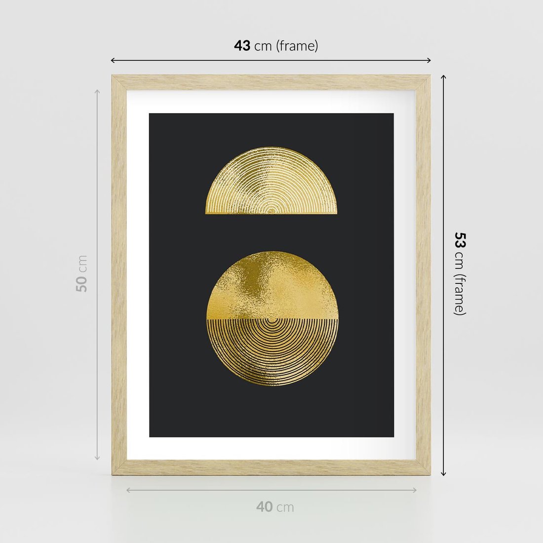 Plakat w ramie 40x50 - Migotliwe Przeniknięcia - złote koła, czarne tło - rama drewno