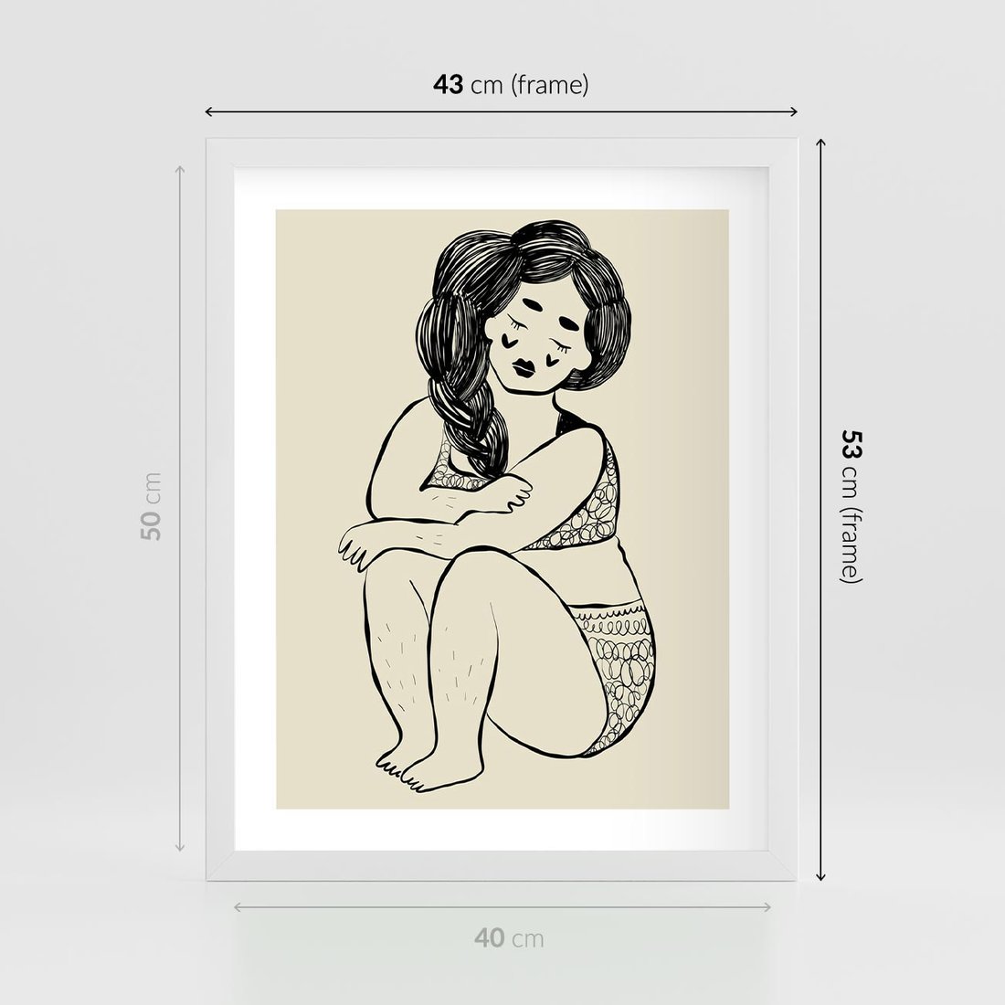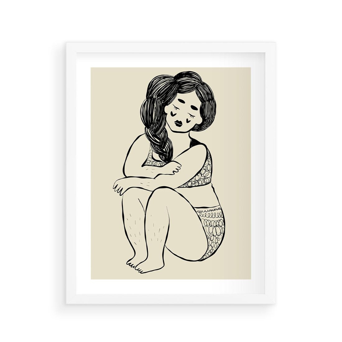 Ten nowoczesny minimalistyczny rysunek ukazuje delikatną siłę kobiecej postaci w bieliźnie, podkreślając ważność akceptacji i piękna w jego najczystszej formie.