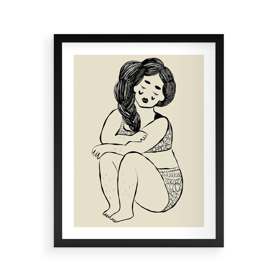 Ten nowoczesny minimalistyczny rysunek ukazuje delikatną siłę kobiecej postaci w bieliźnie, podkreślając ważność akceptacji i piękna w jego najczystszej formie.