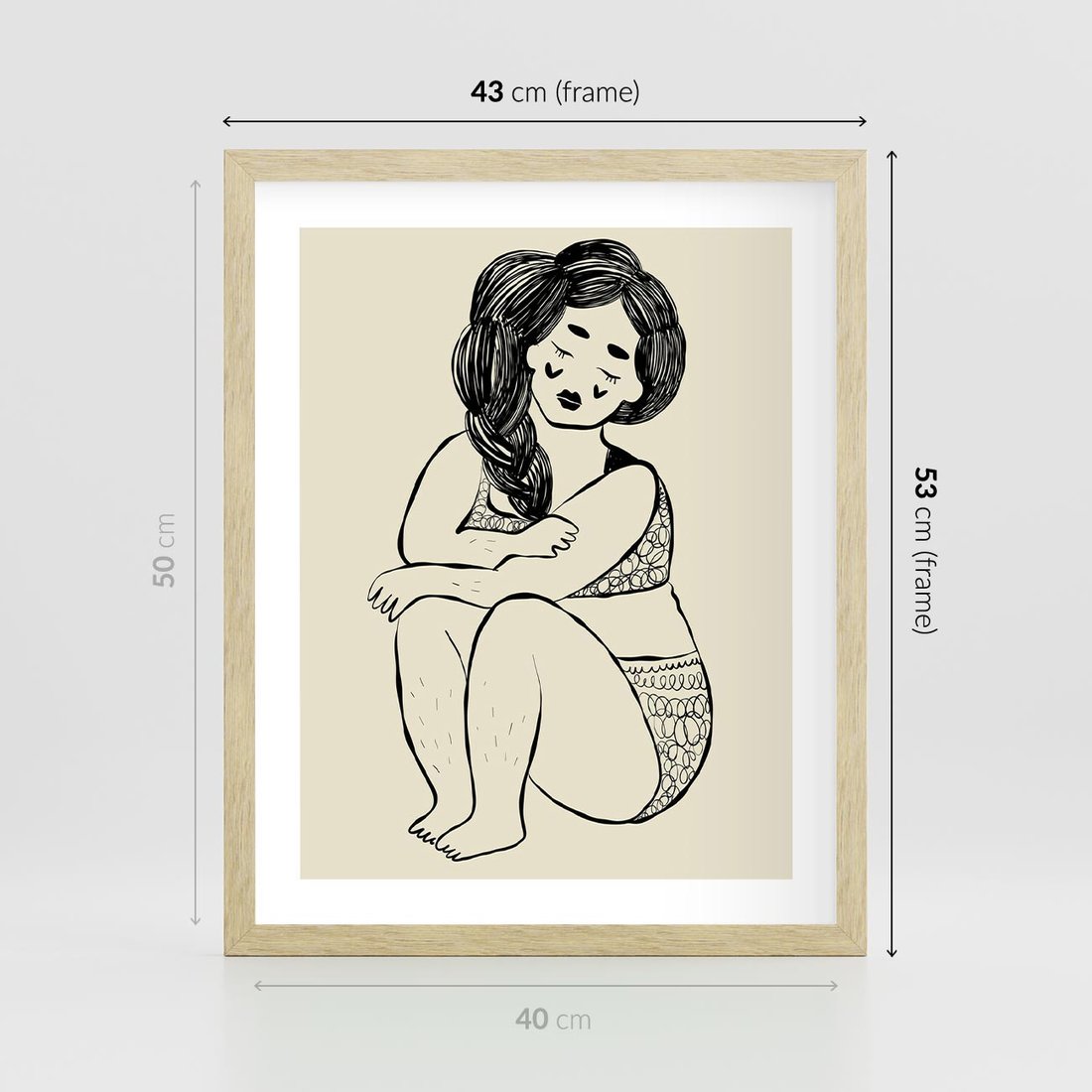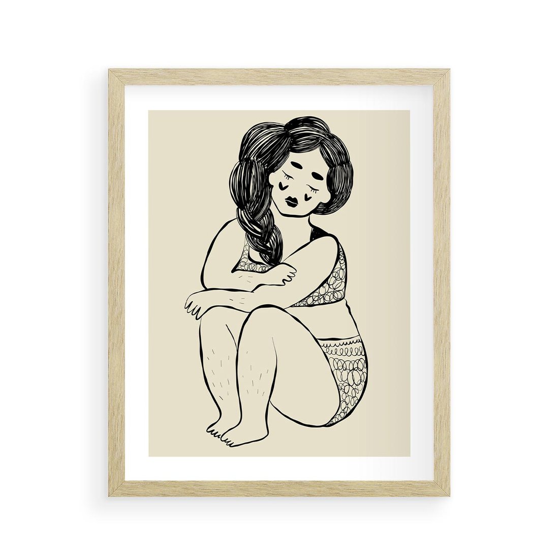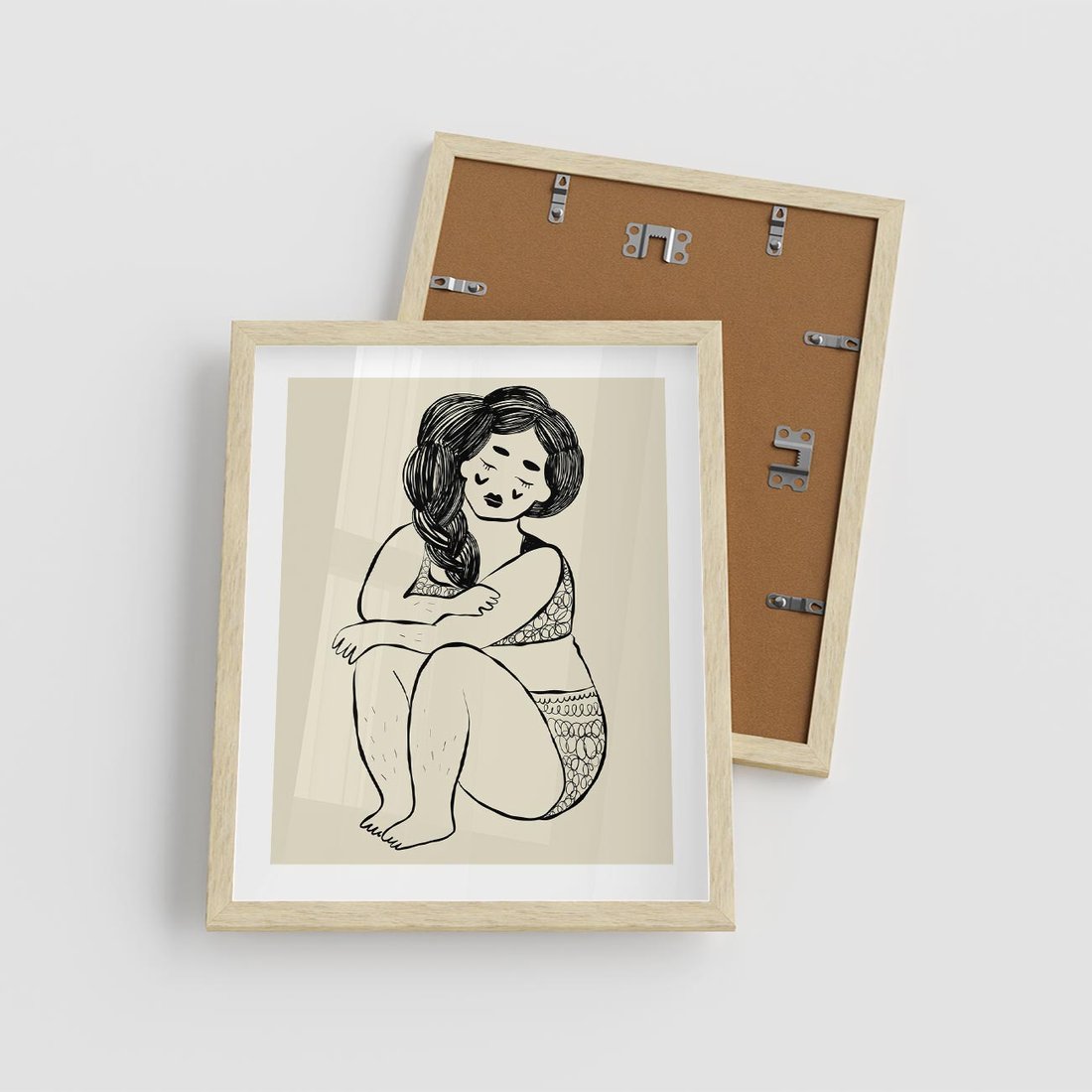 Ten nowoczesny minimalistyczny rysunek ukazuje delikatną siłę kobiecej postaci w bieliźnie, podkreślając ważność akceptacji i piękna w jego najczystszej formie.