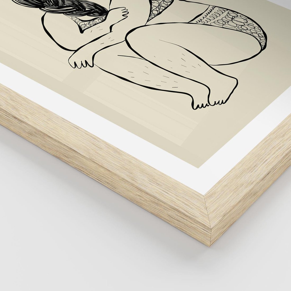 Plakat w ramie 40x50 - Migotliwe Refleksje - nowoczesny minimalistyczny rysunek, dziewczyna w bieliźnie - rama drewno
