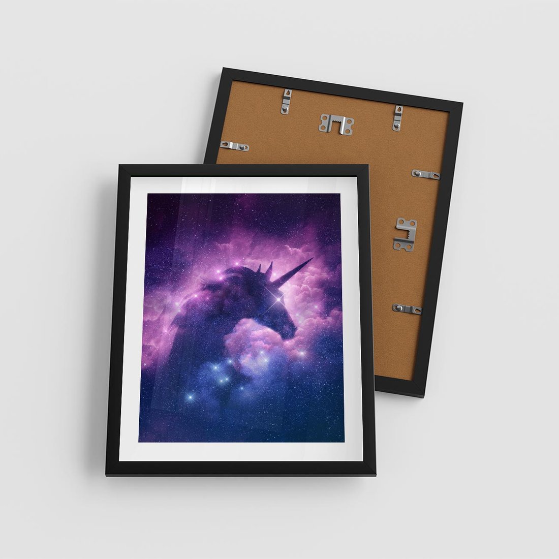 Przenieś się w nieodkryte rejony kosmosu w towarzystwie jednorożca na obrazie. Odczuj magię i tajemniczość tego stworzenia, przenikając w świat fantazji i wyobraźni.