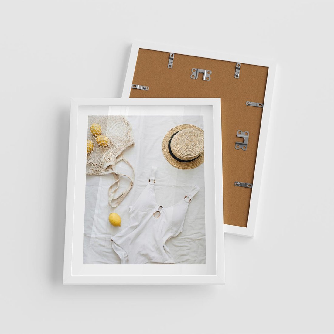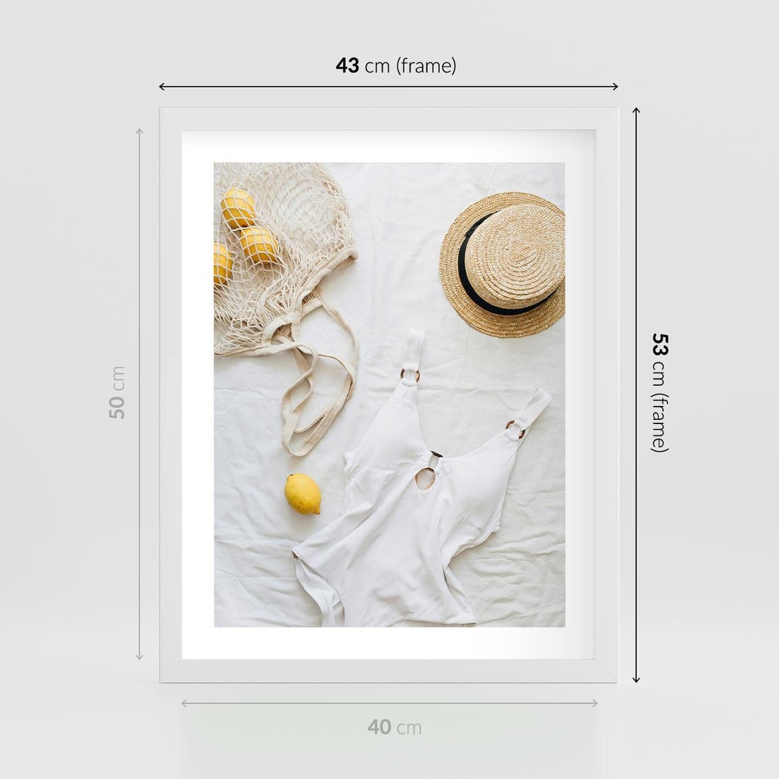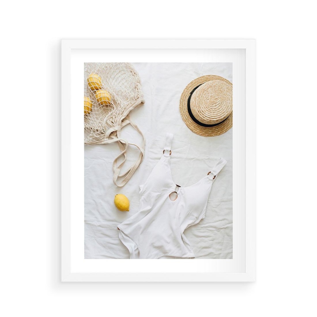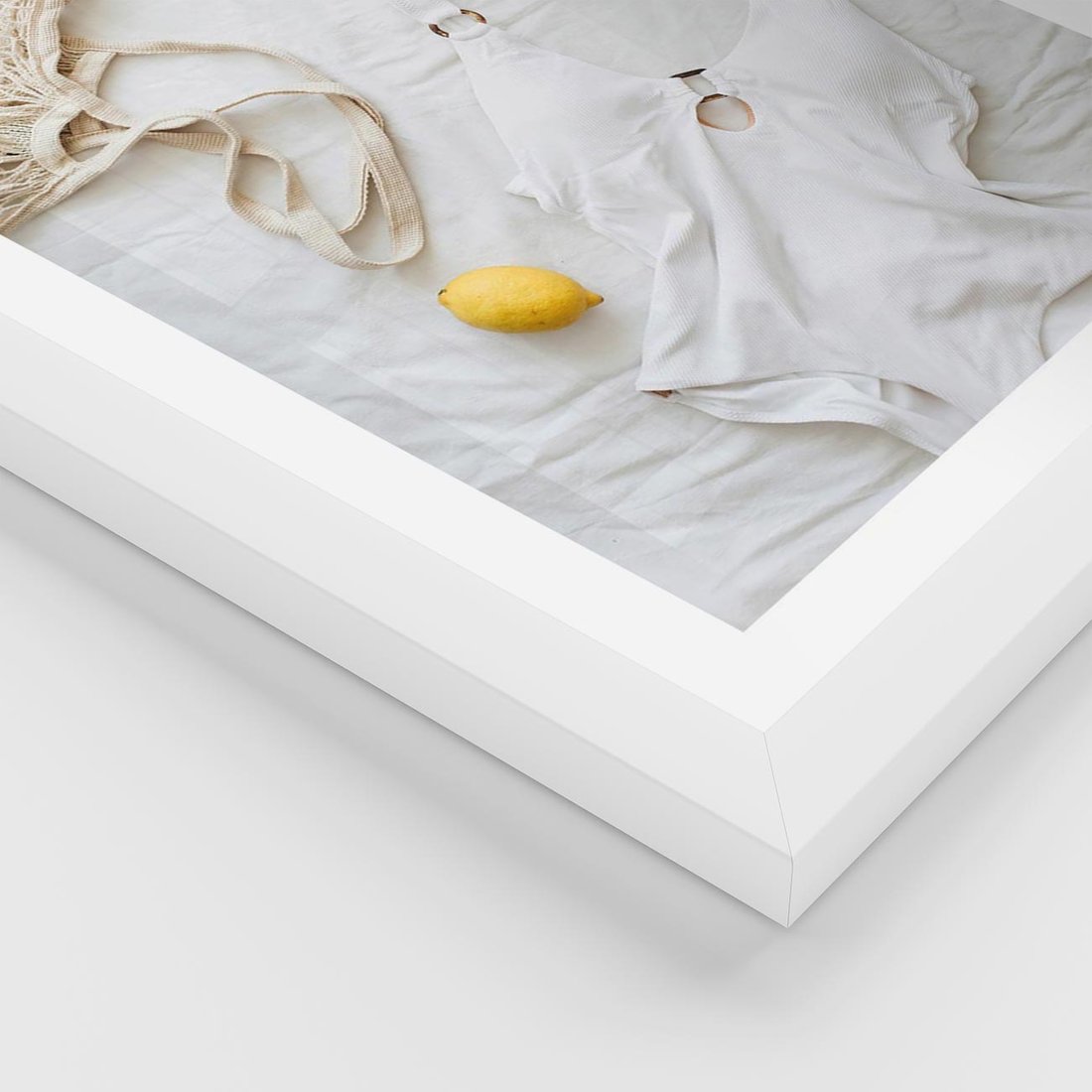 Plakat w ramie 40x50 - Moda na Wakacje: Cytrynowy Urok - kompozycja letnia, fashion - rama biała