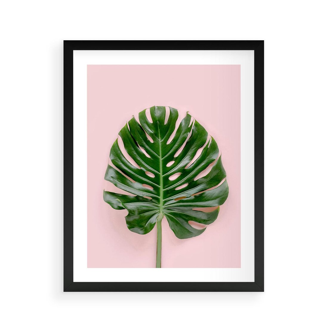 Minimalistyczny obraz przedstawia liść monstery na różowym tle, tworząc spokojny i delikatny motyw.
