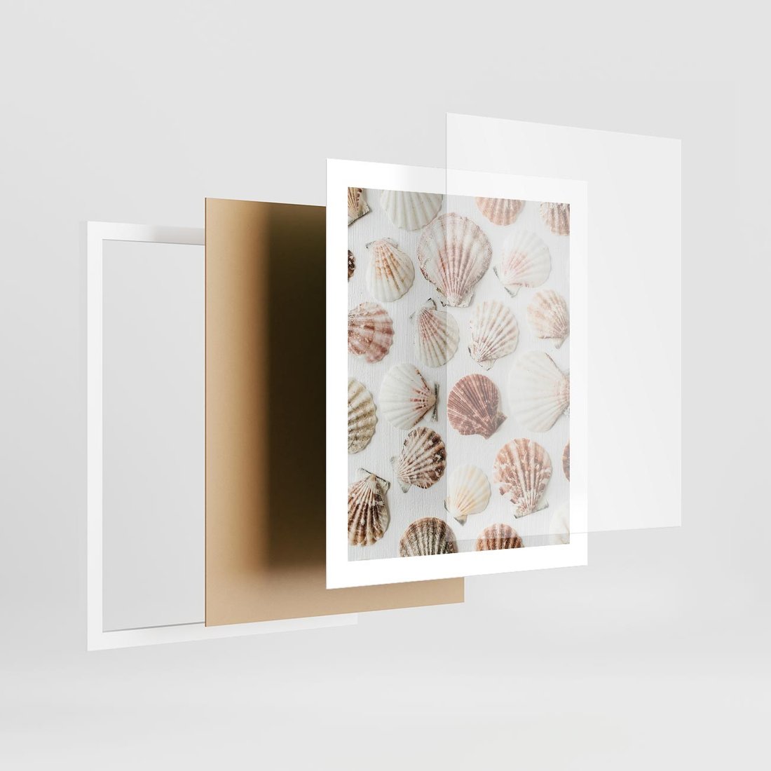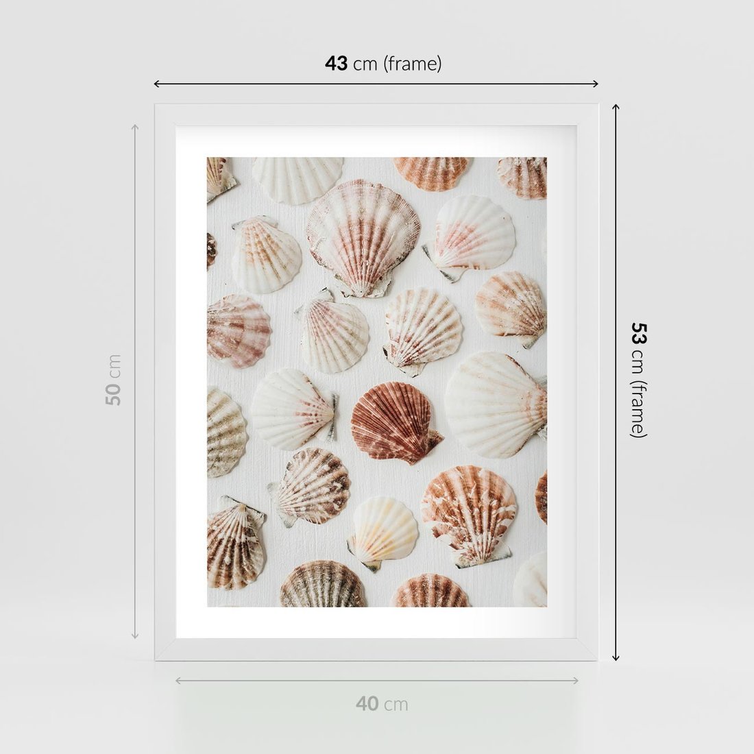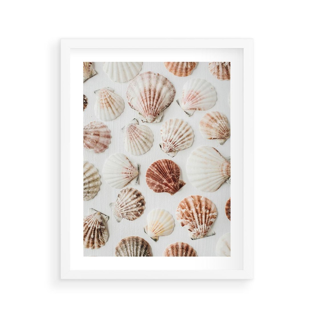 Plakat w ramie 40x50 - Morska Delikatność: Muszelki na Białym Tle - kompozycja, morskie muszelki na białym tle - rama biała