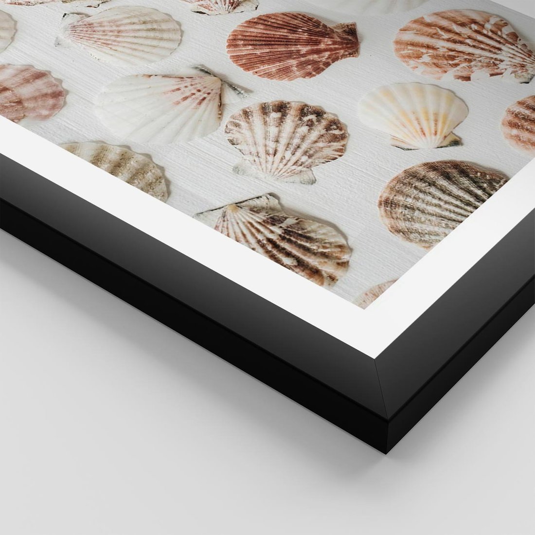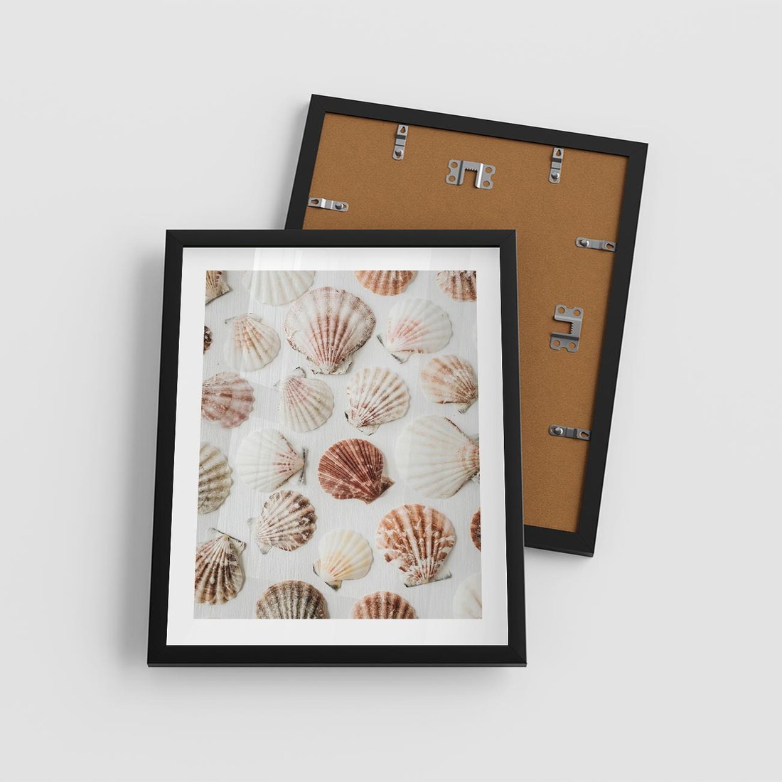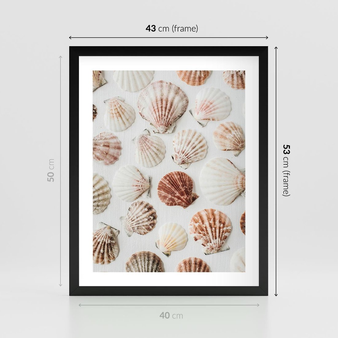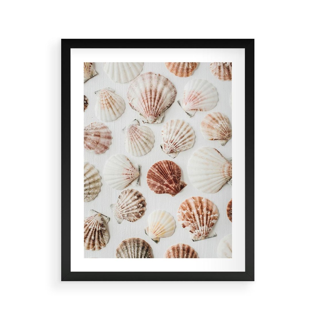 Plakat w ramie 40x50 - Morska Delikatność: Muszelki na Białym Tle - kompozycja, morskie muszelki na białym tle - rama czarna
