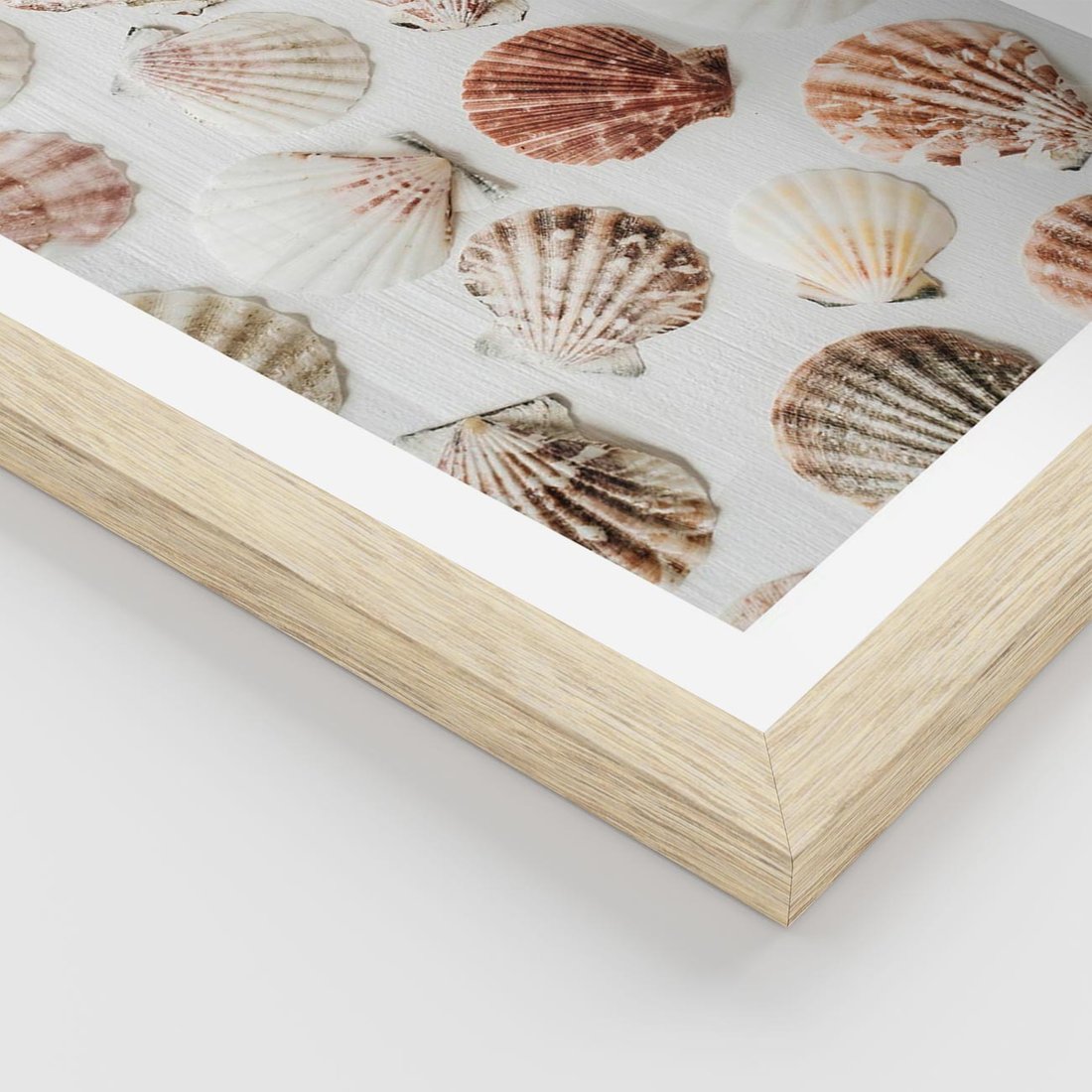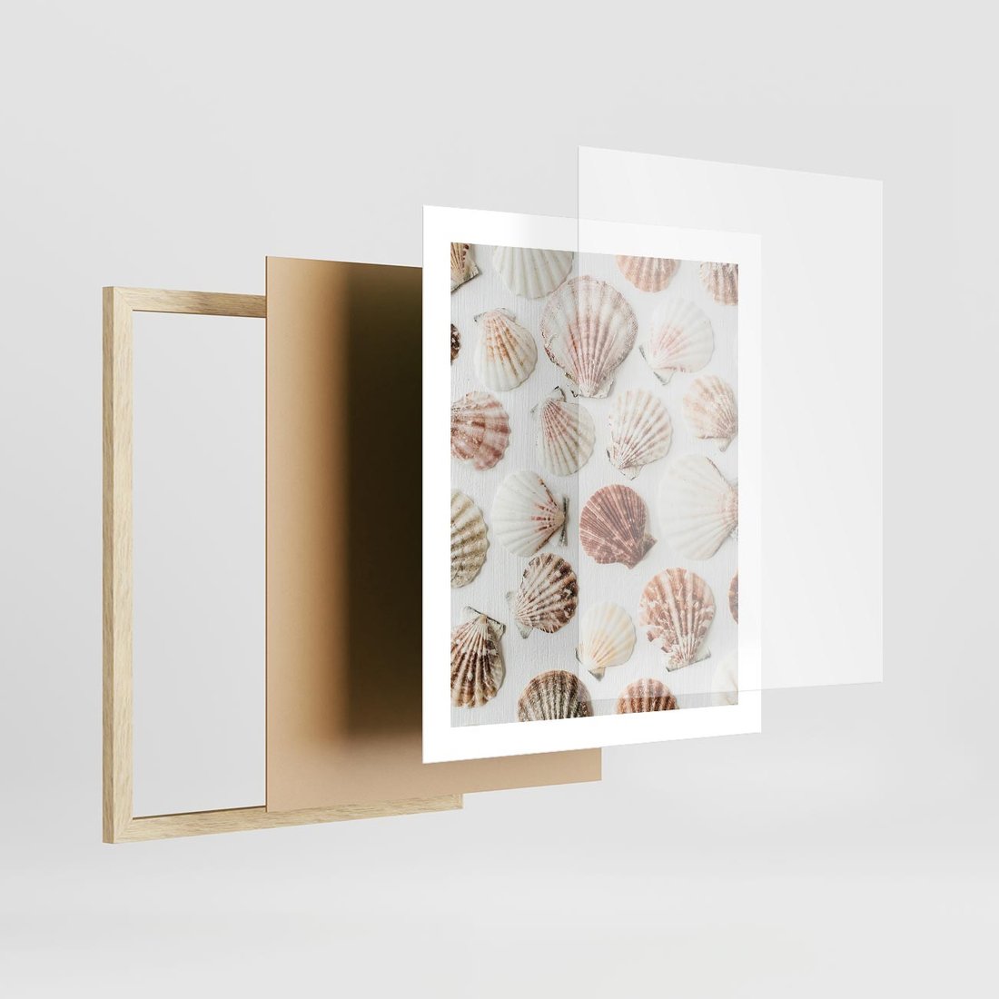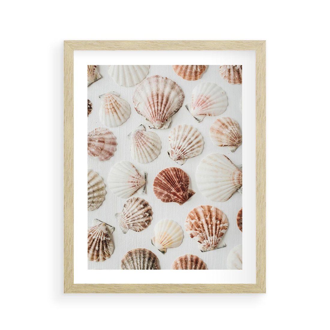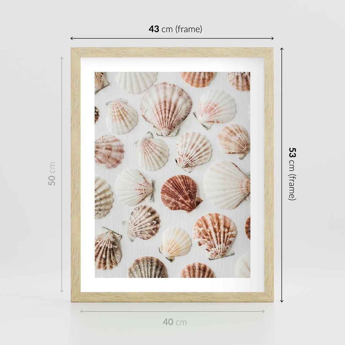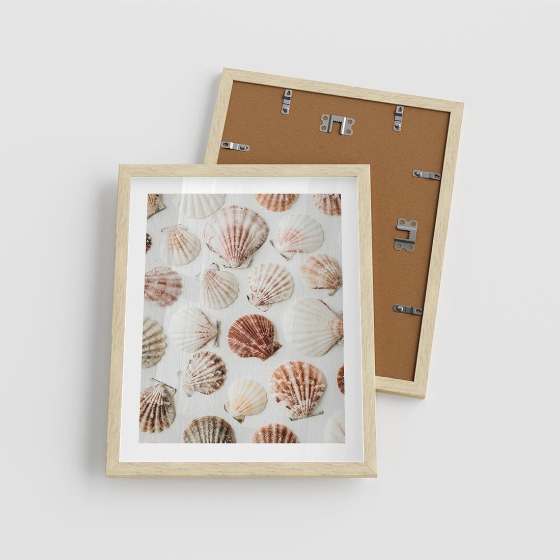 Plakat w ramie 40x50 - Morska Delikatność: Muszelki na Białym Tle - kompozycja, morskie muszelki na białym tle - rama drewno