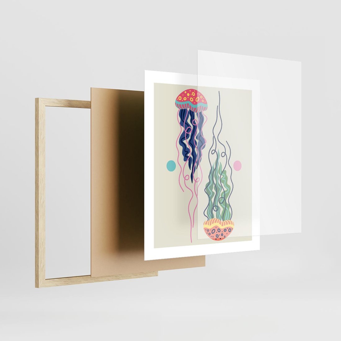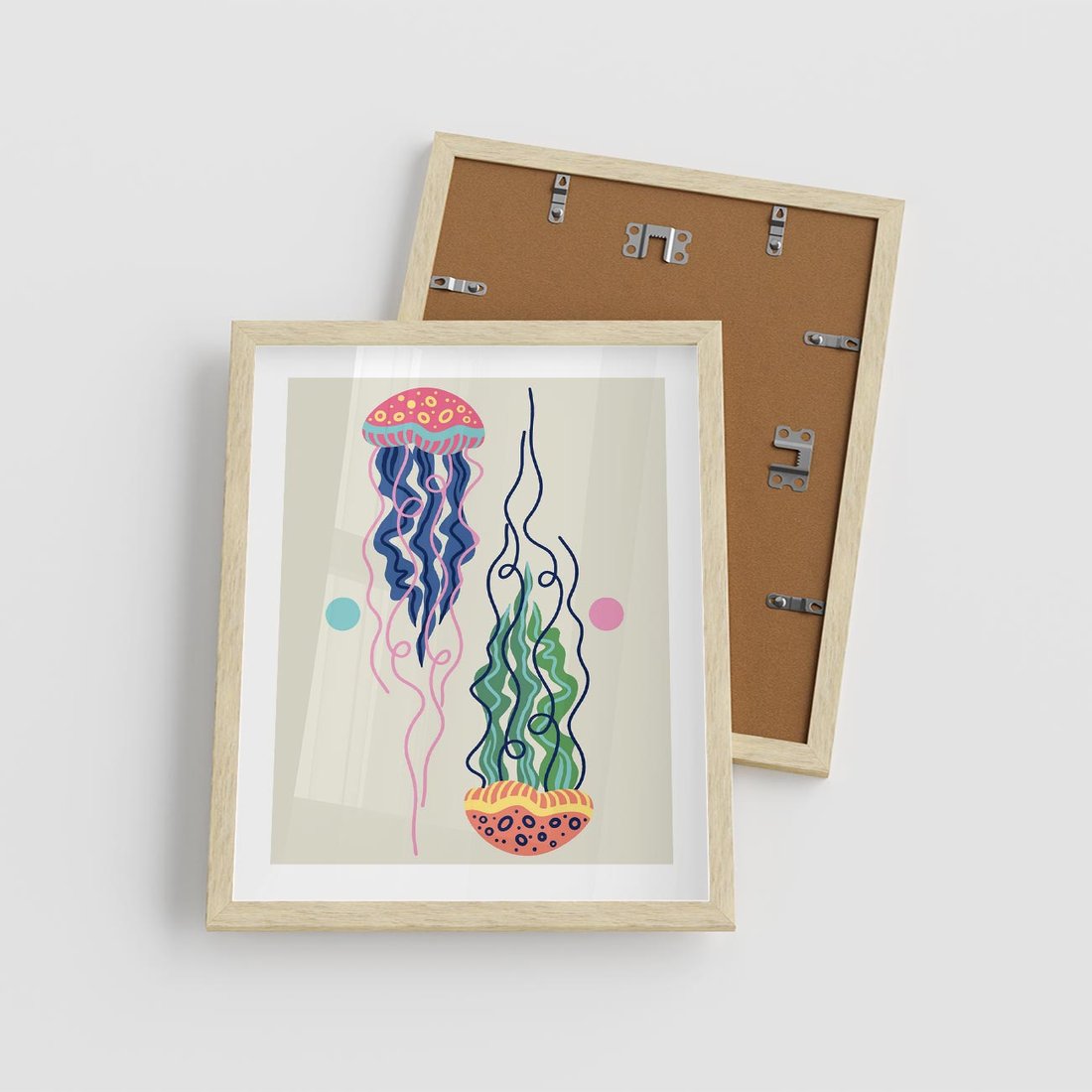 Ten nowoczesny i optymistyczny plakat przedstawia kolorowe meduzy, tworząc radosną atmosferę. To dzieło sztuki wniesie do Twojej przestrzeni żywość i pozytywne wibracje, tworząc jednocześnie wyjątkowy akcent artystyczny. Idealny wybór, aby dodać koloru i energii do swojego otoczenia.