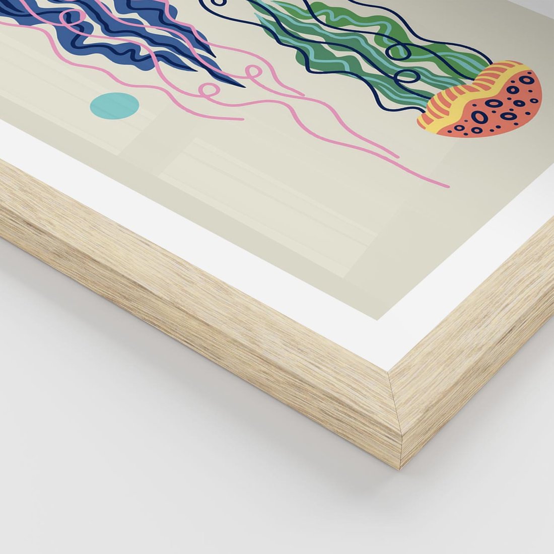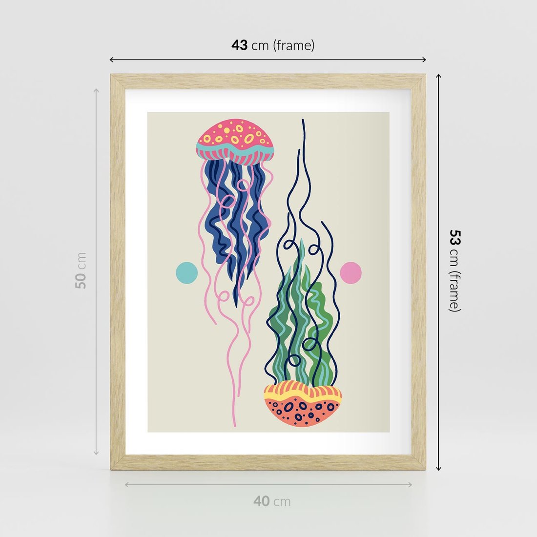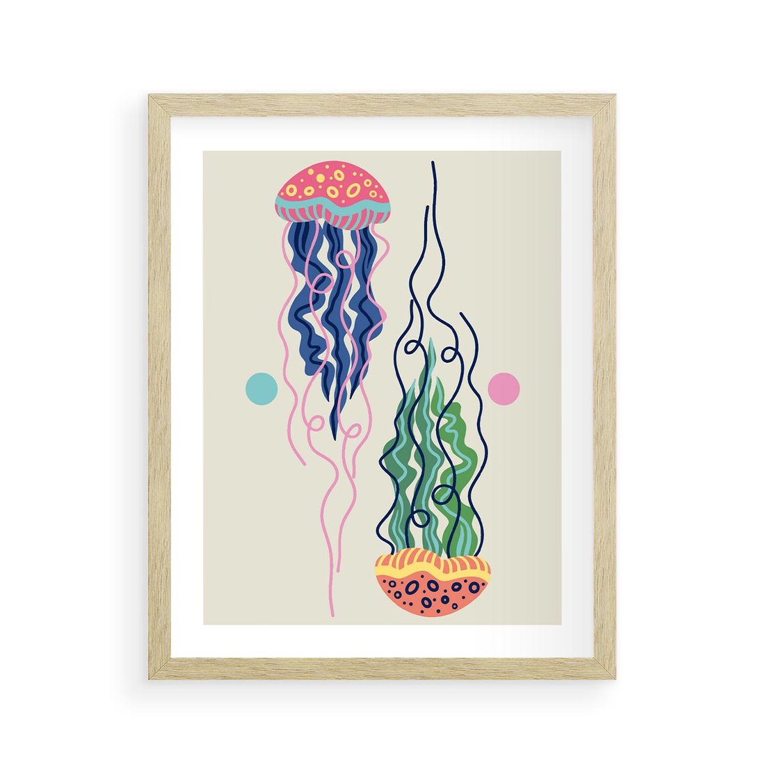 Plakat w ramie 40x50 - Morskie Pulsacje - nowoczesny optymistyczny plakat, kolorowe meduzy - rama drewno