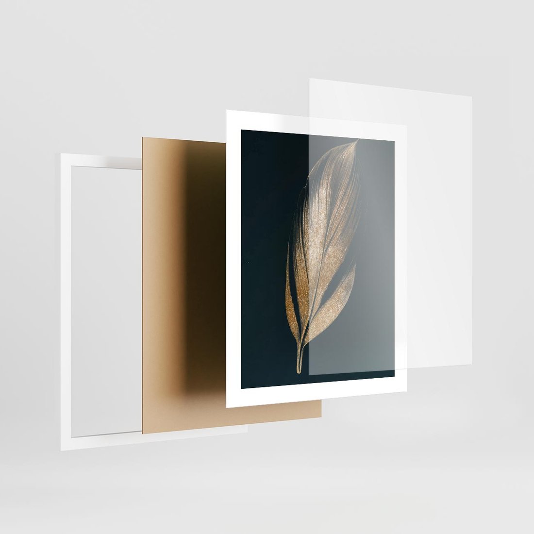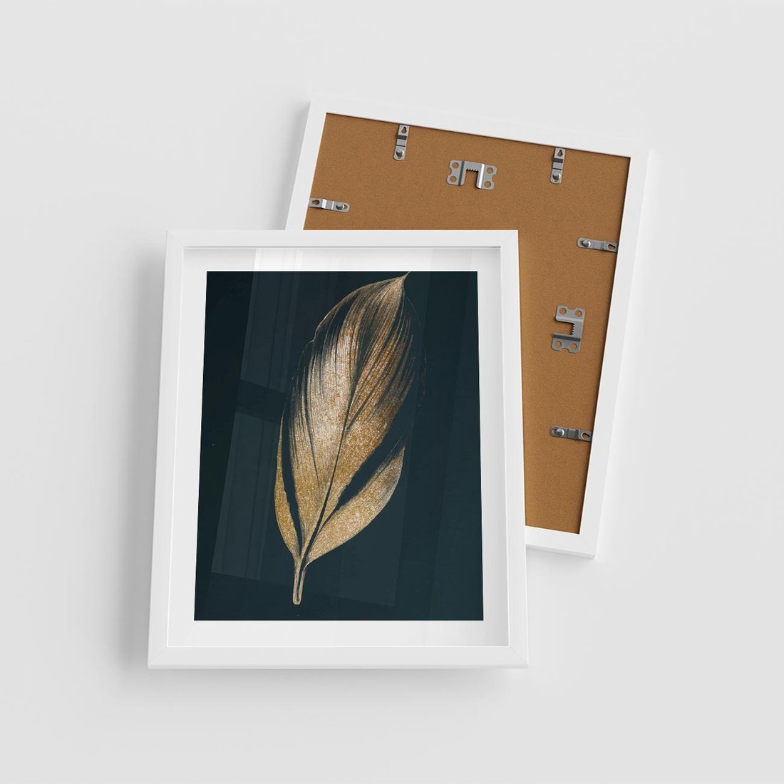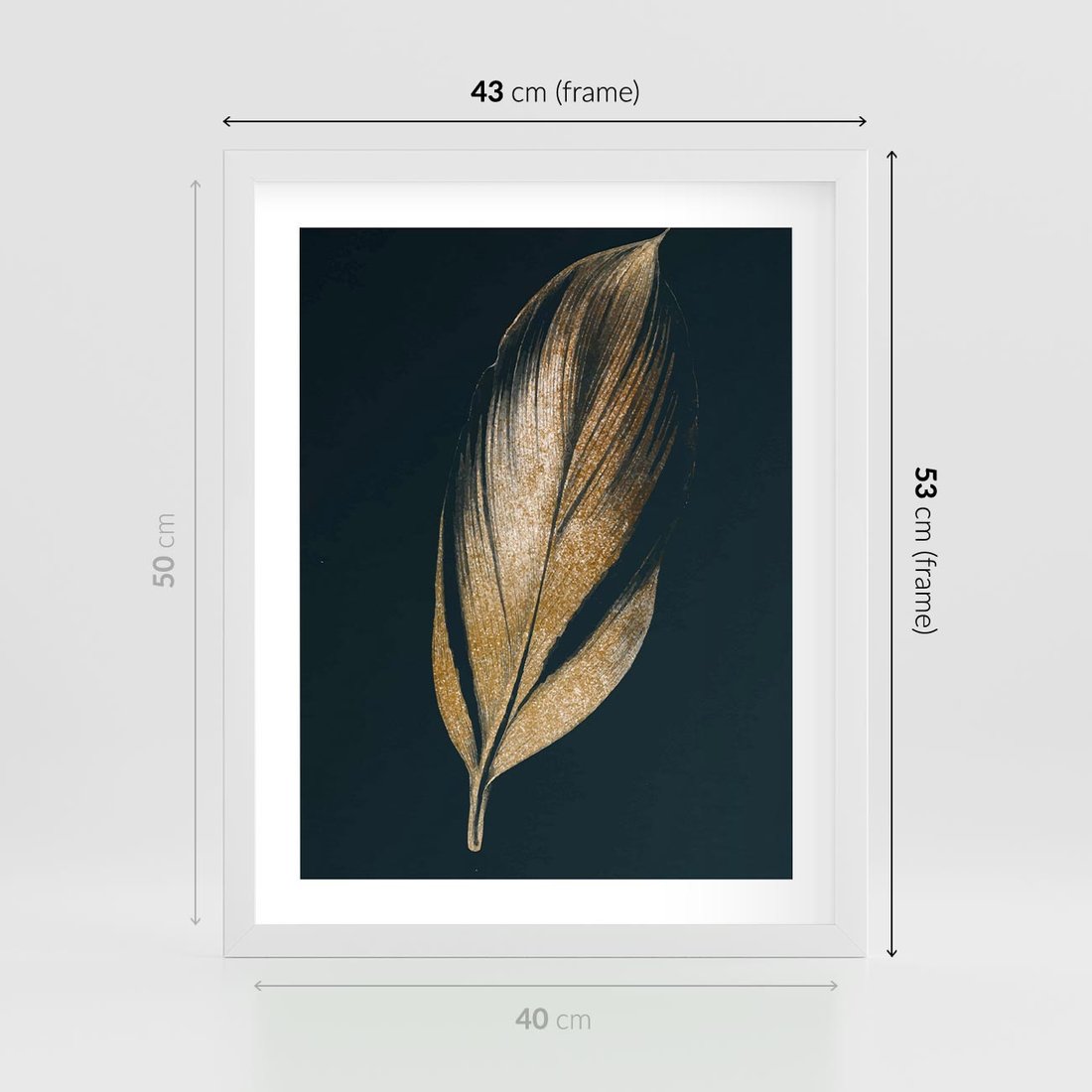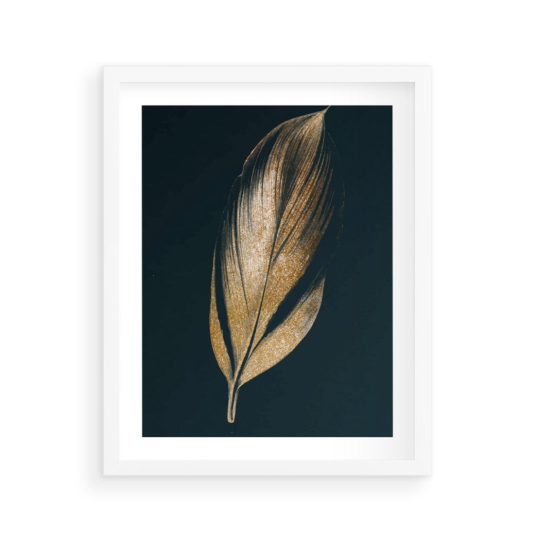 Plakat w ramie 40x50 - Mroczne Złoto - nowoczesna grafika, złoty liść na czarnym tle - rama biała