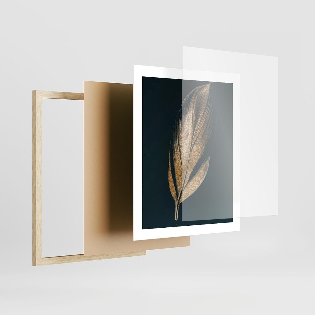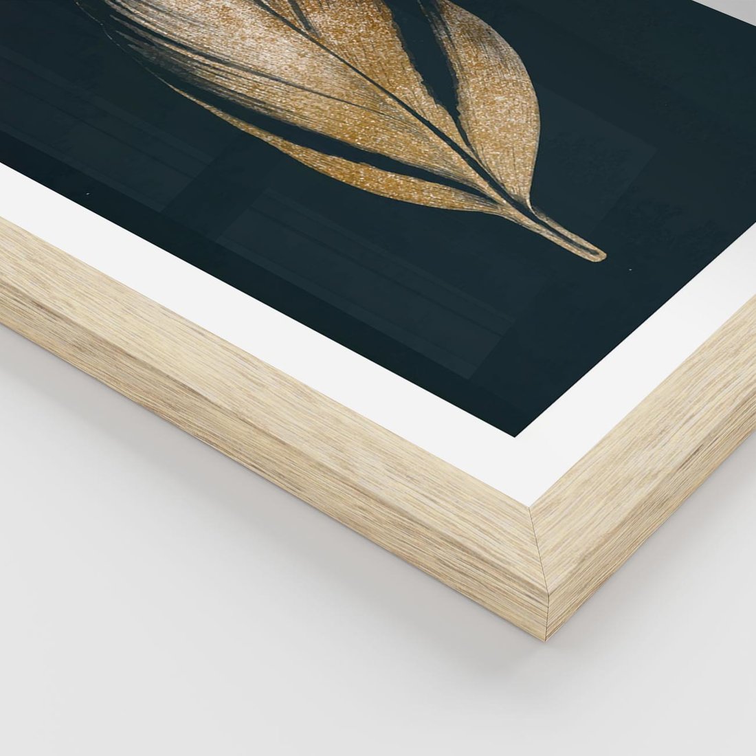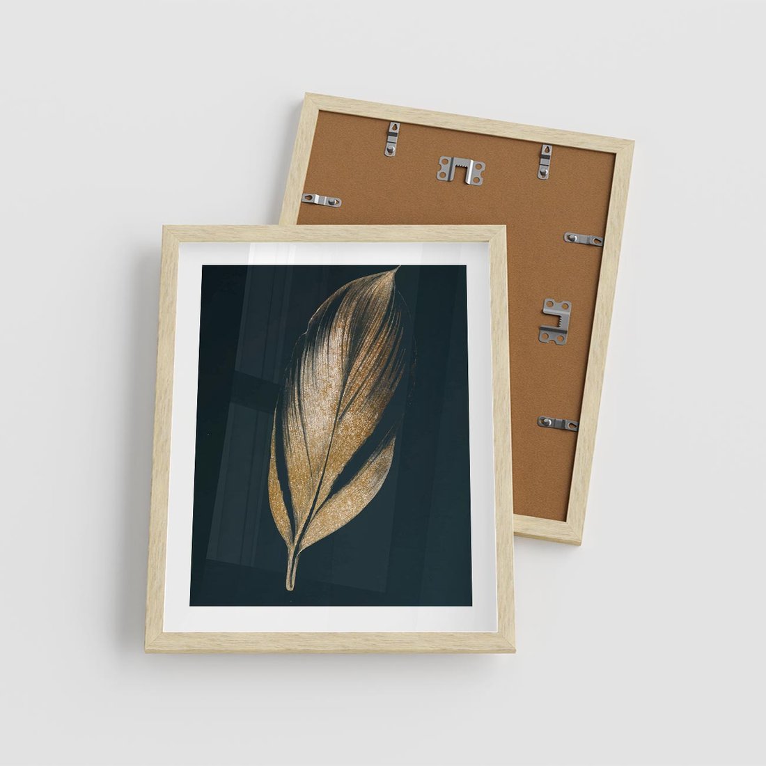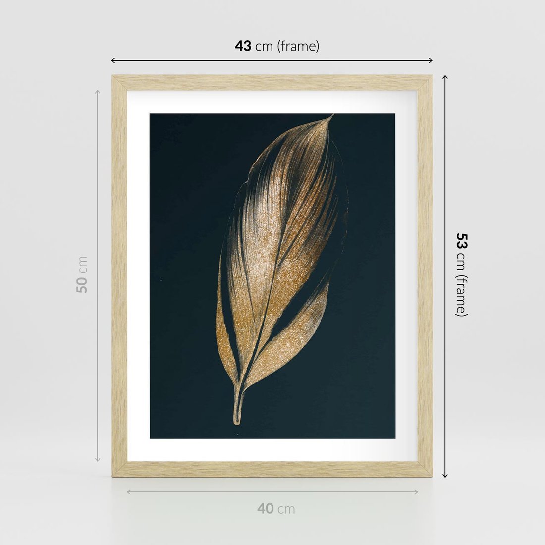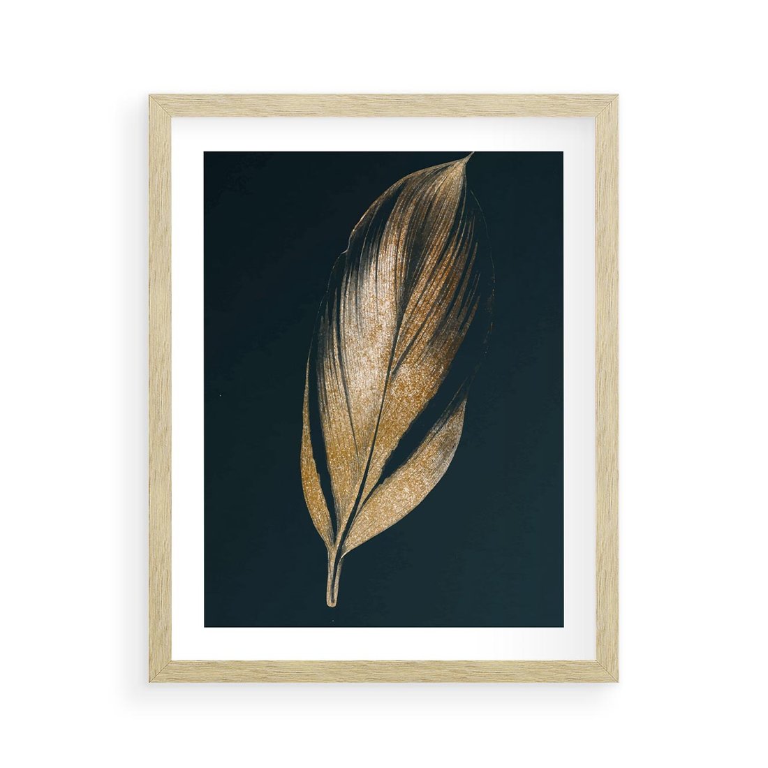 Plakat w ramie 40x50 - Mroczne Złoto - nowoczesna grafika, złoty liść na czarnym tle - rama drewno